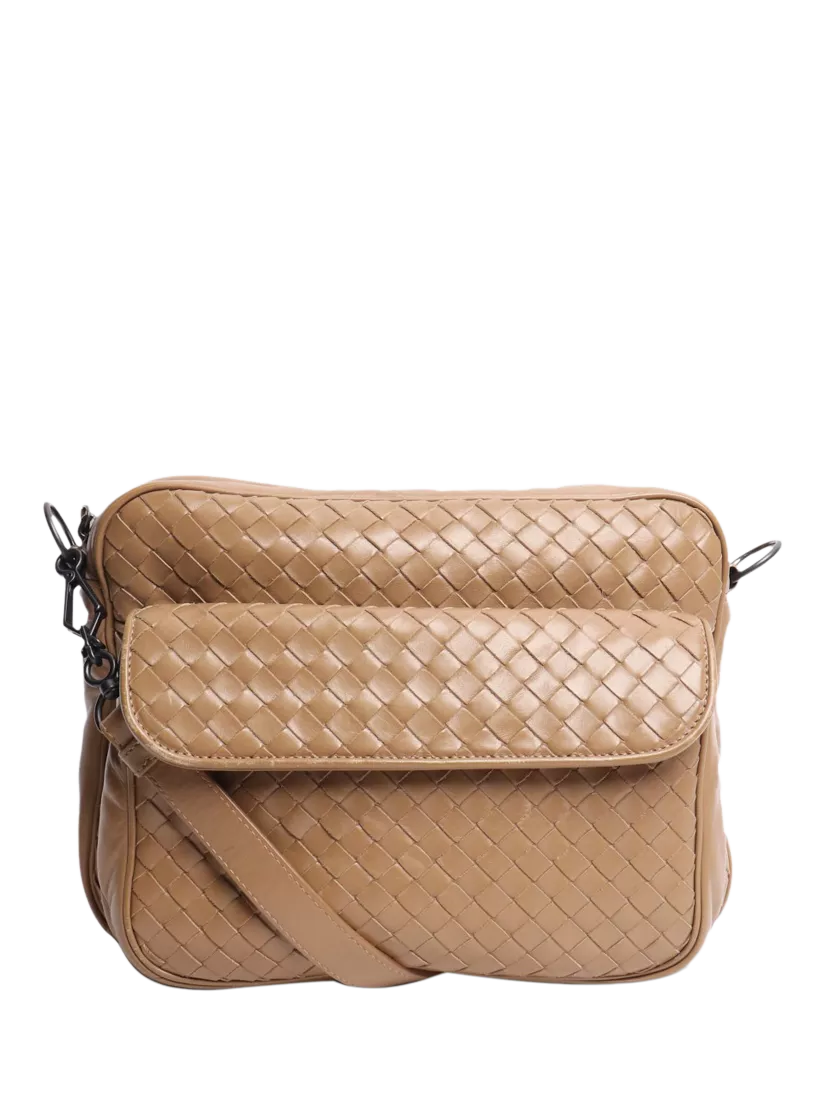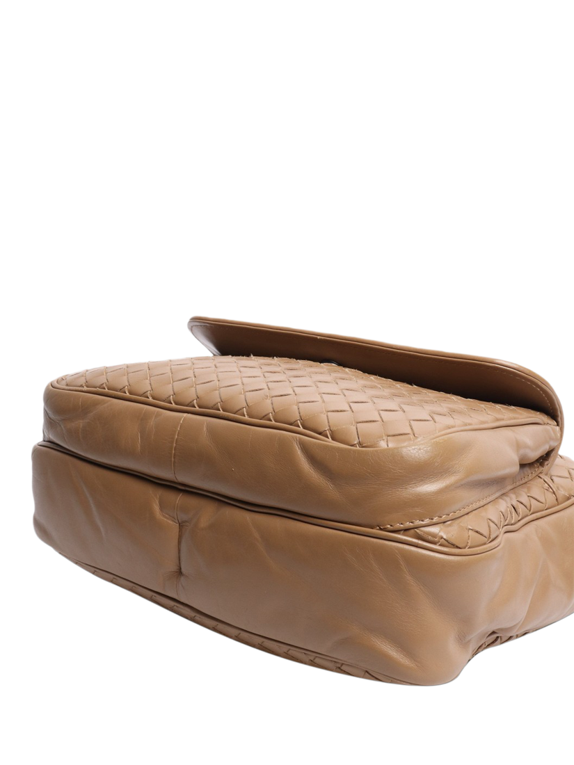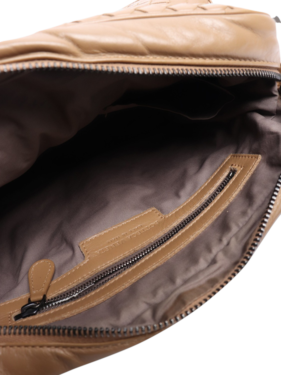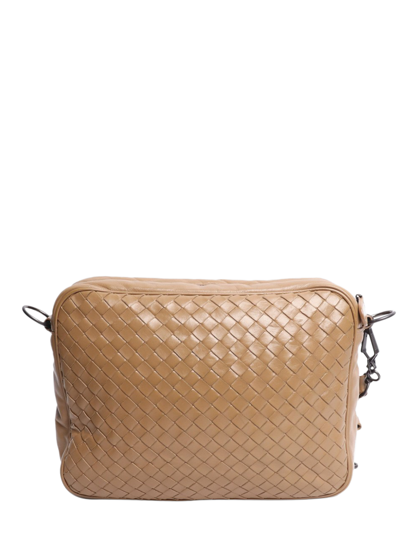 Pre-loved Bottega Veneta light brown interwoven camera bag with gunmetal hardware. This bag has a main compartment, a zippped pocket and a phone pocket. A magnetic closure pocket at the front.