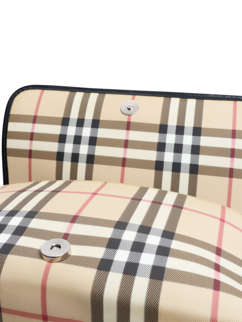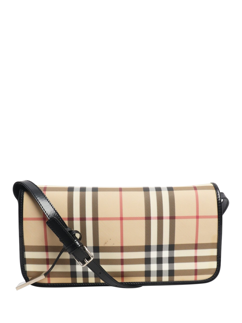 Pre-loved Burberry neutral Nova Check shoulder bag with silver hardware and leather trims. This bag has an adjustable strap. The bag has a main compartment with interior zipped and patch pockets. Outer slip pockets on the front and rear of the bag.