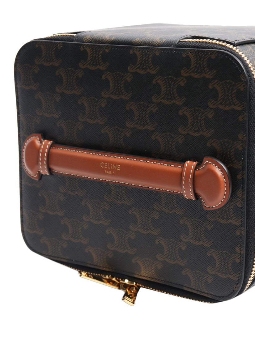 Pre-loved CELINE brown square vanity case in canvas with calfskin leather trims. This bag has a main zipped compartment with an interior slip pocket. Comes with mirror.
