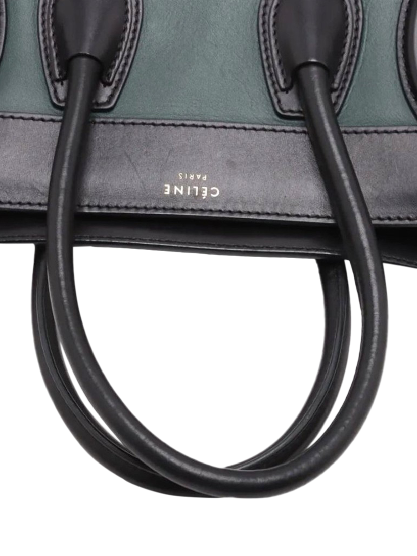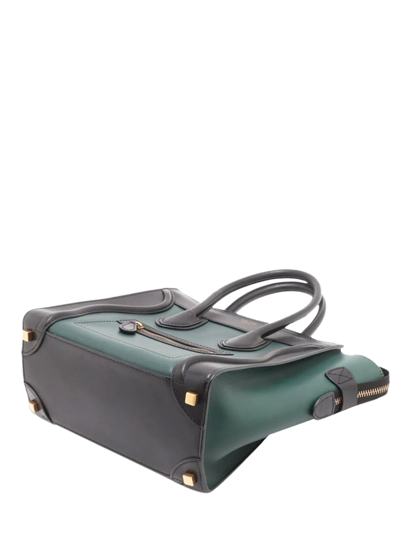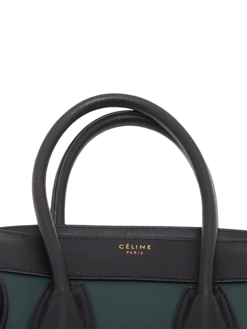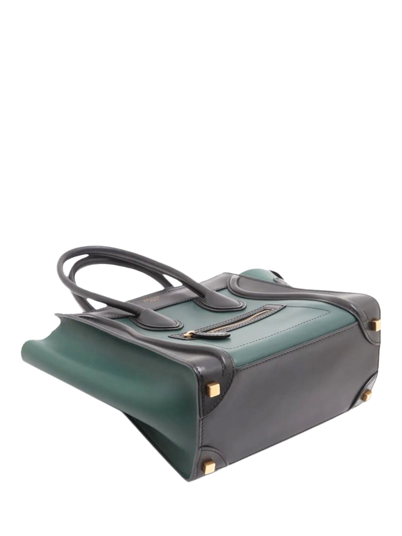 Pre-loved CELINE dark green and black Micro Luggage bag. This bag has two handles and a main zipped compartment with interior zipped and patch pockets. Outer zipped pocket at the front. Metal feet on the base.