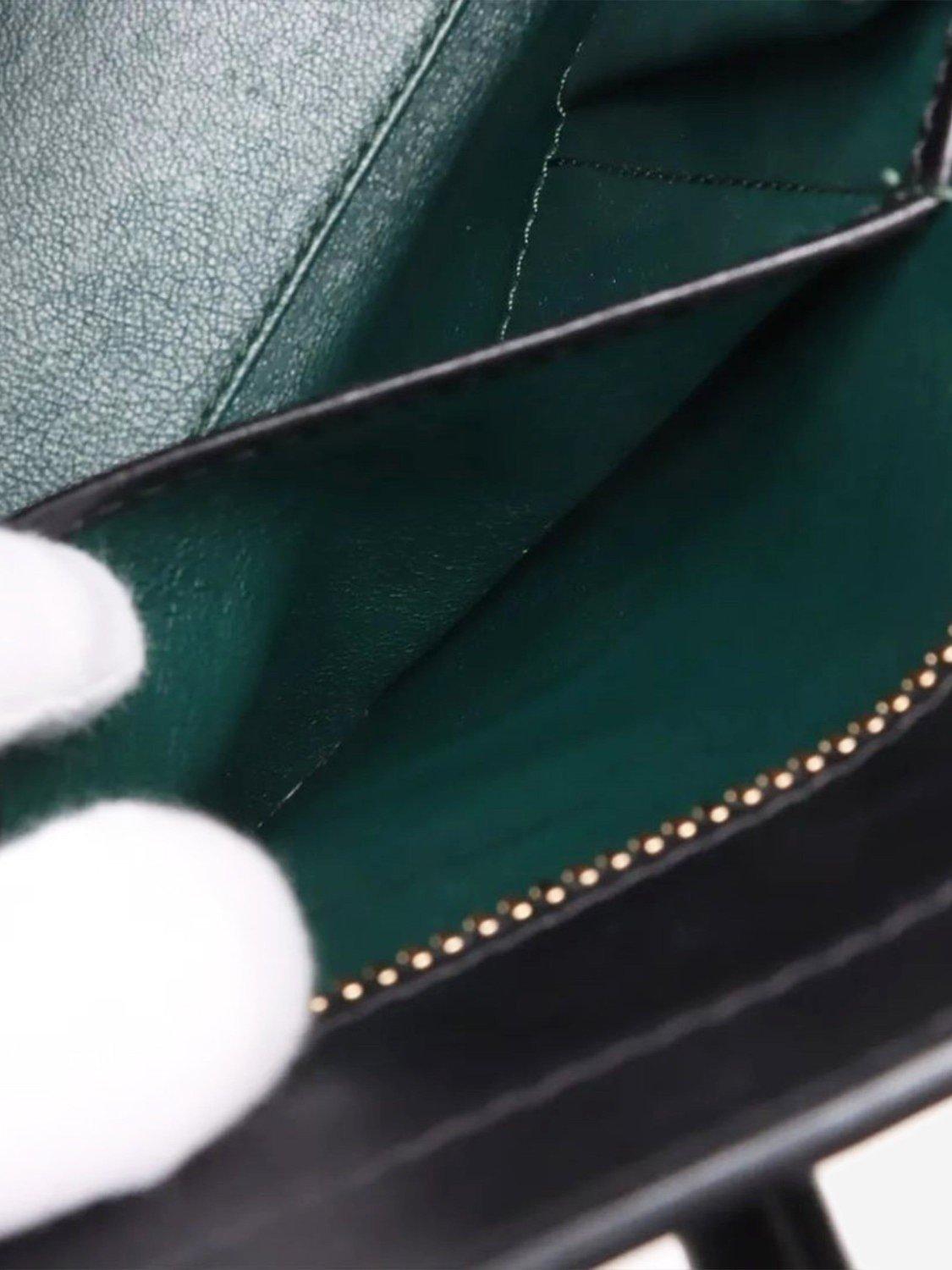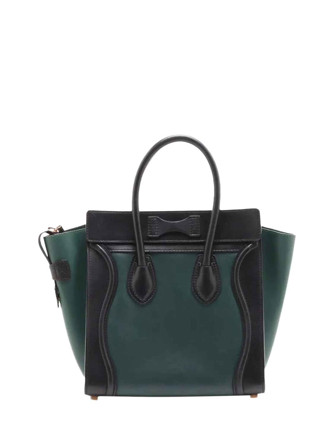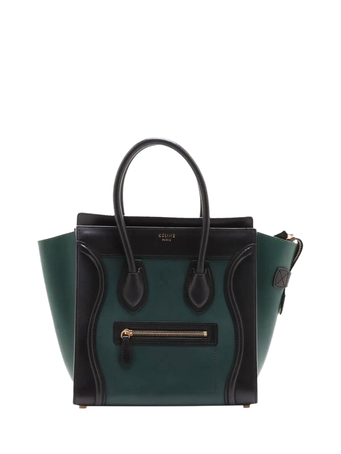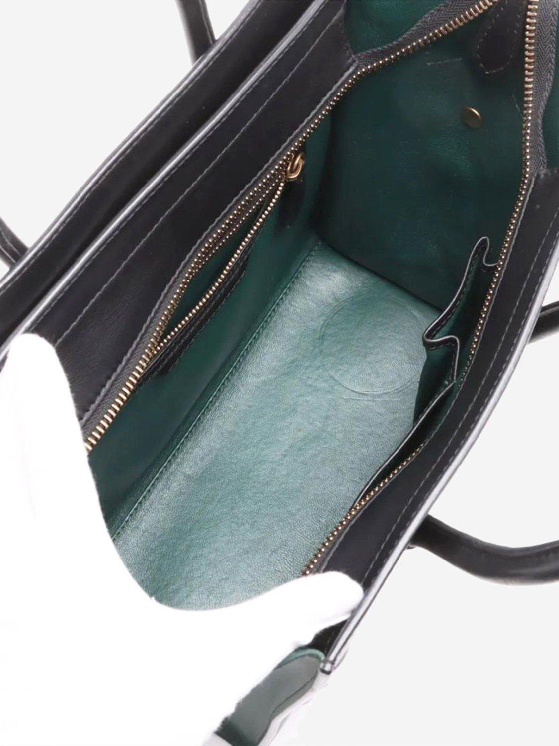 Pre-loved CELINE dark green and black Micro Luggage bag. This bag has two handles and a main zipped compartment with interior zipped and patch pockets. Outer zipped pocket at the front. Metal feet on the base.
