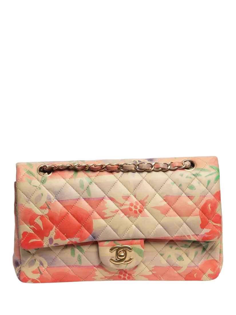 Pre-loved CHANEL multicolour 2009 medium lambskin diamond-quilted watercolour Classic Double Flap bag with gold hardware. This bag has a signature CC turn-lock closure on the flap. The bag has a main compartment with interior patch pockets and a front slip pocket. Concealed zipped pocket on the underside of the flap. Adjustable chain and leather shoulder strap. Outer slip pocket at the rear.