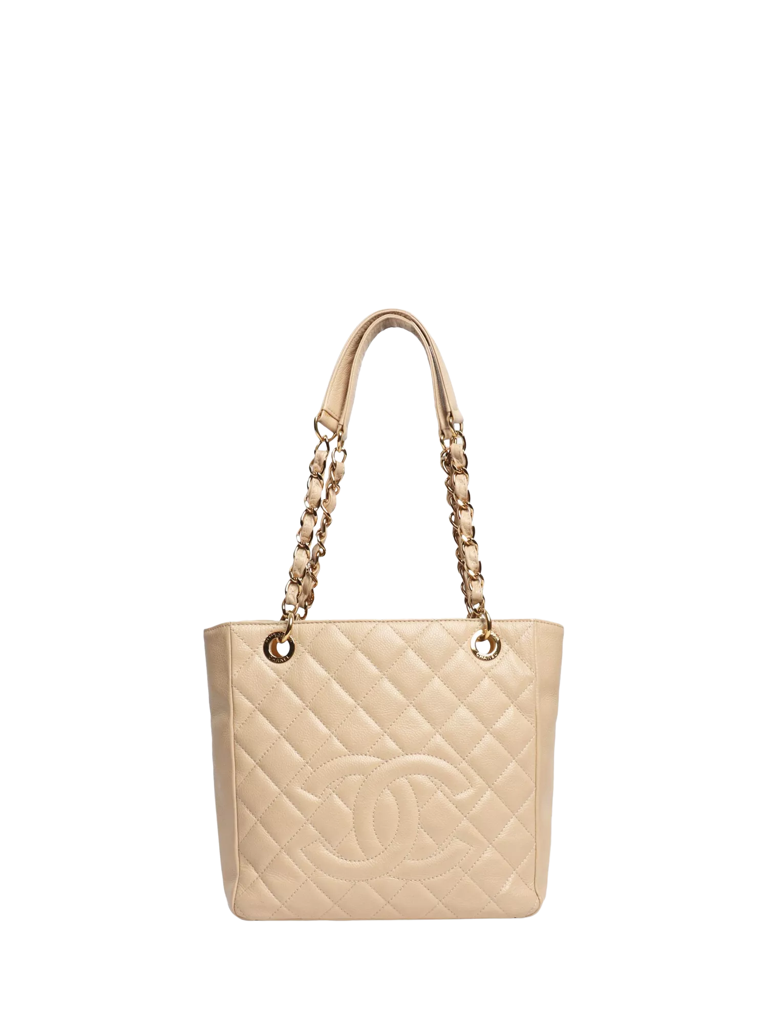 Pre-loved CHANEL blush 2010 caviar-quilted petit GST bag with gold hardware. This bag has a main compartment with interior zipped and slip pockets. It's finished with CC branding on the front, an outer slip pocket at the rear, and chain and leather handles.