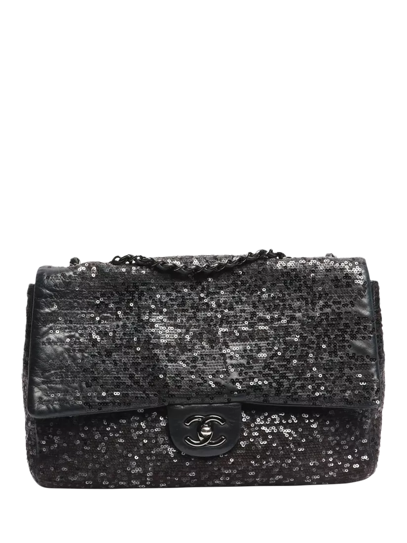 Pre-loved CHANEL black 2011 jumbo sequin-embellished Classic Single Flap bag with gunmetal hardware. This bag has a signature CC turn-lock closure on the flap. This bag has a main compartment with an interior zipped pocket. Outer slip pocket on the rear. Adjustable sliding chain strap.