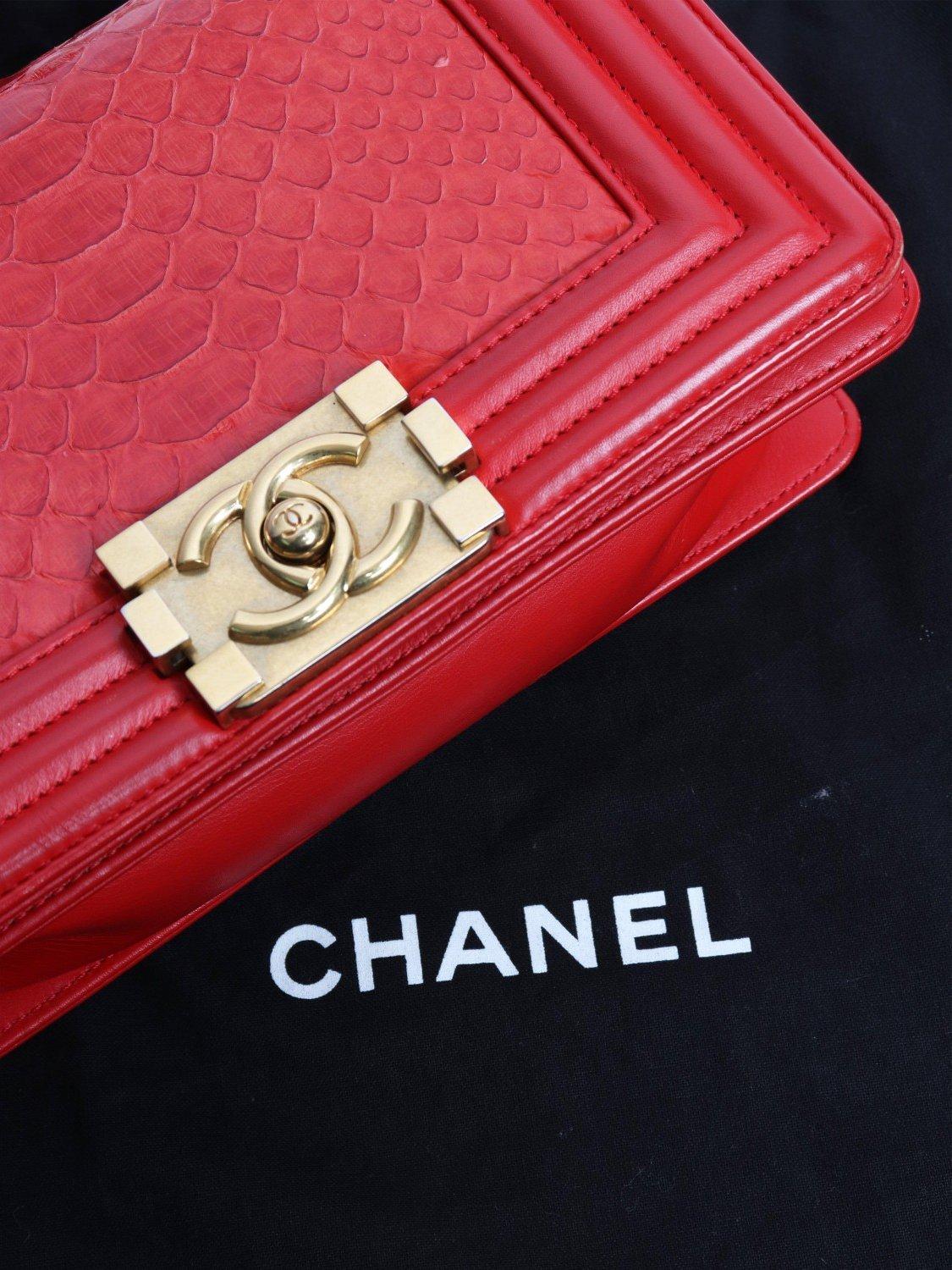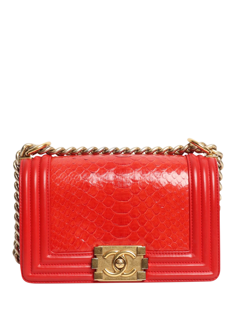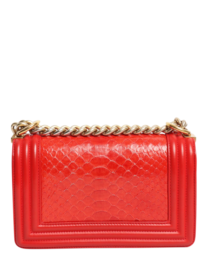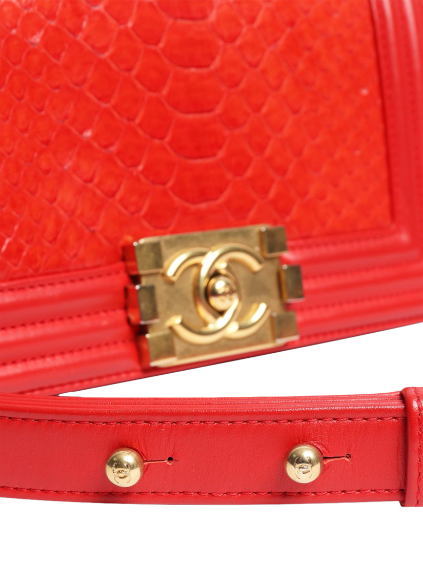 Pre-loved CHANEL red python Boy bag with gold hardware. This bag has a sliding chain strap and a main compartment with interior zipped and patch pockets. Signature Boy push-lock closure on the flap.
