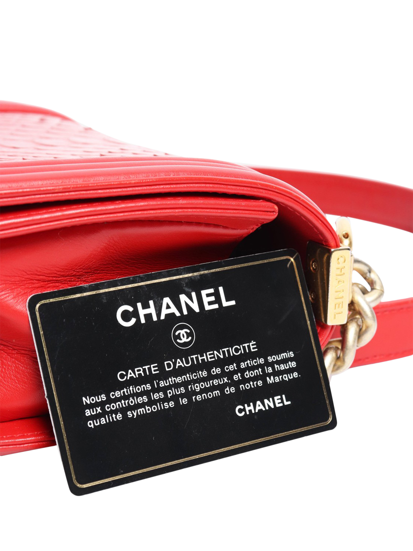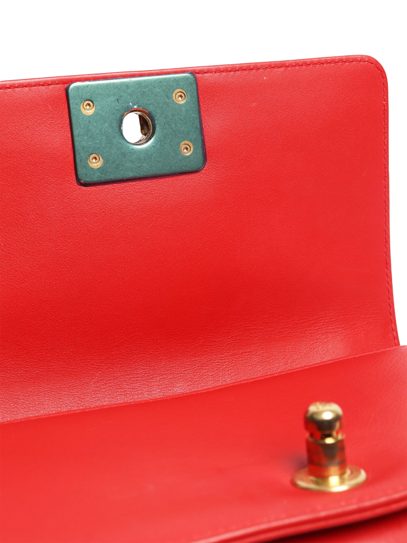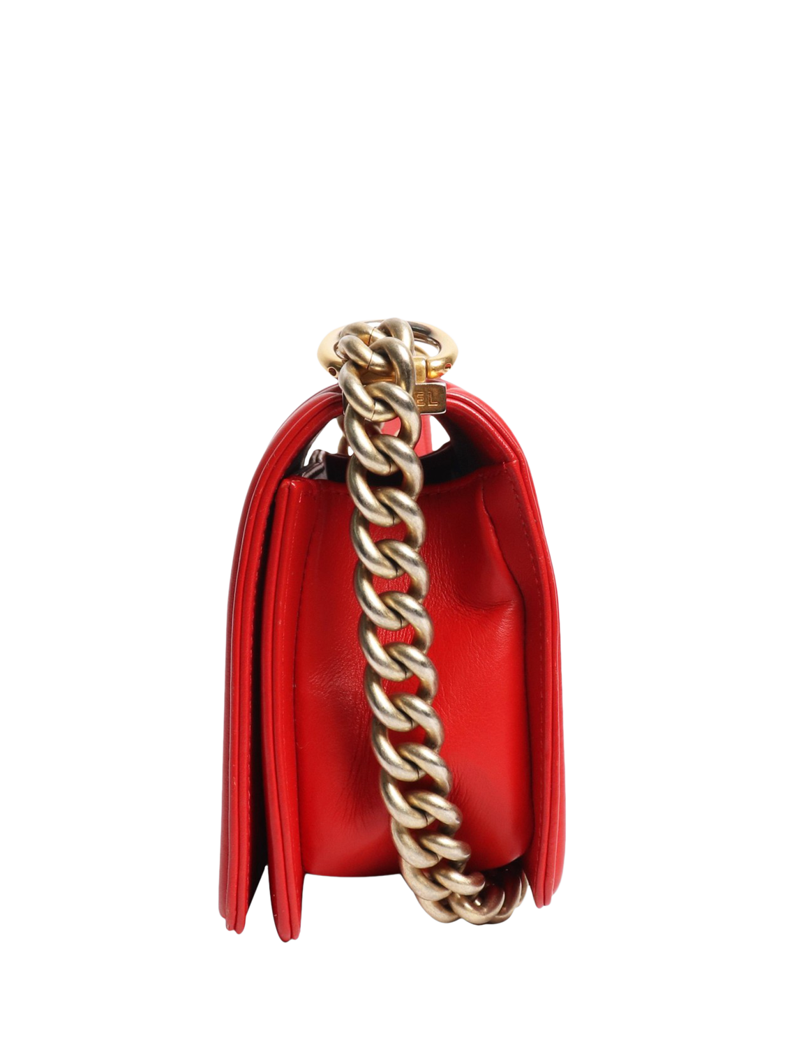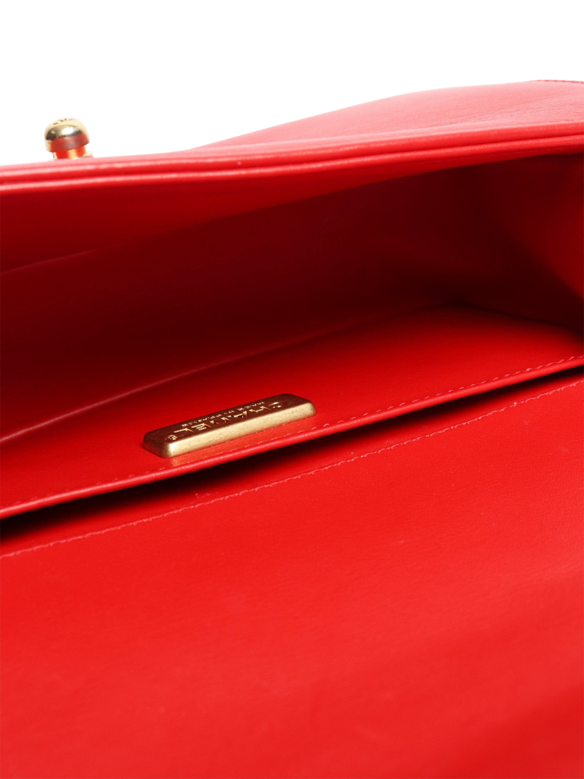 Pre-loved CHANEL red python Boy bag with gold hardware. This bag has a sliding chain strap and a main compartment with interior zipped and patch pockets. Signature Boy push-lock closure on the flap.