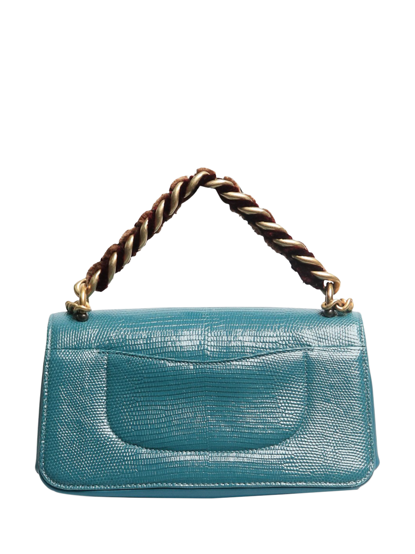Pre-loved CHANEL 2018 turquoise exotic flap shoulder bag with gold hardware. This bag has a mink fur-lined chain link top handle. Three compartments, interior card pocket, a zipped pocket and a outer slip pocket at the rear.