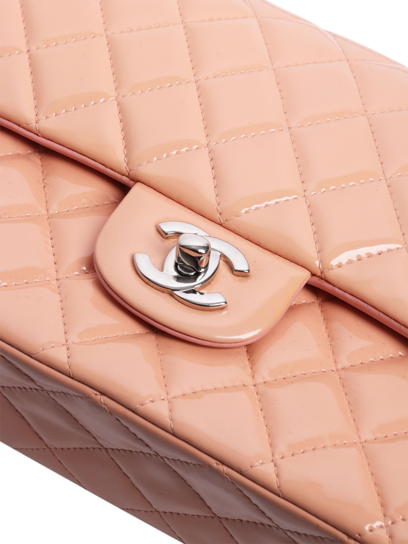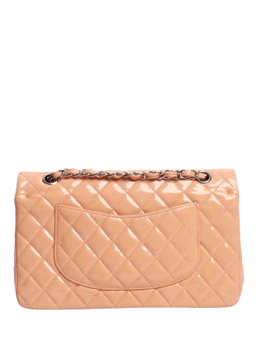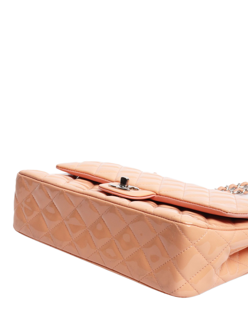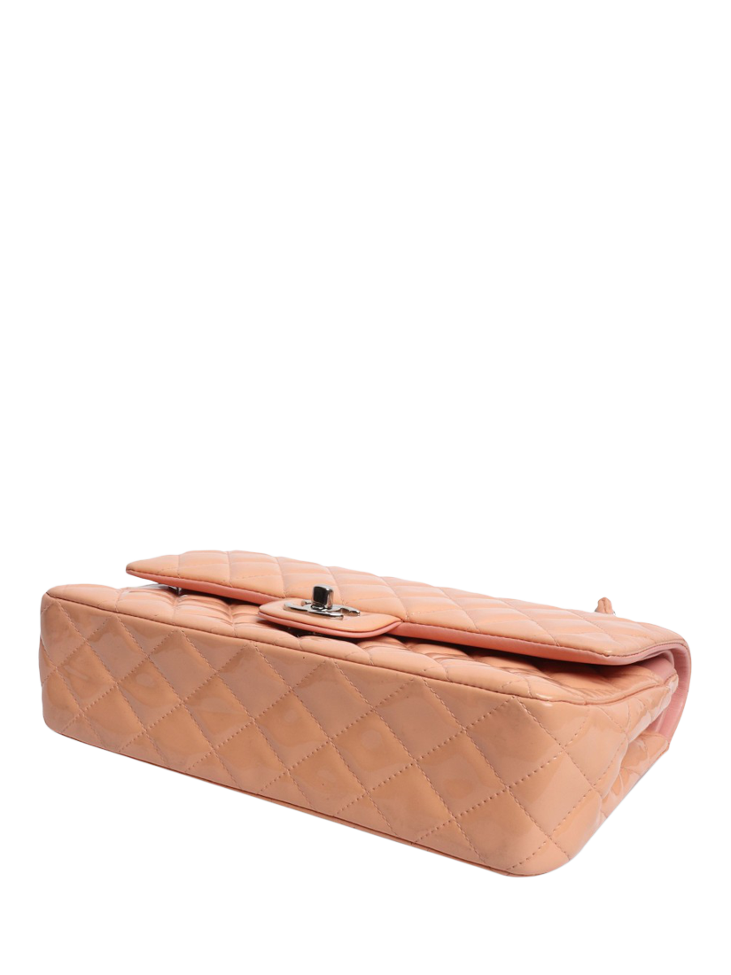 Pre-loved CHANEL peach and pink patent leather double flap bag with silver hardware. This bag has a signature CC turn-lock closure on the flap. The bag has a main compartment with interior patch pockets and a front slip pocket. Concealed zipped pocket on the underside of the flap. Adjustable chain and leather shoulder strap. Outer slip pocket at the rear.