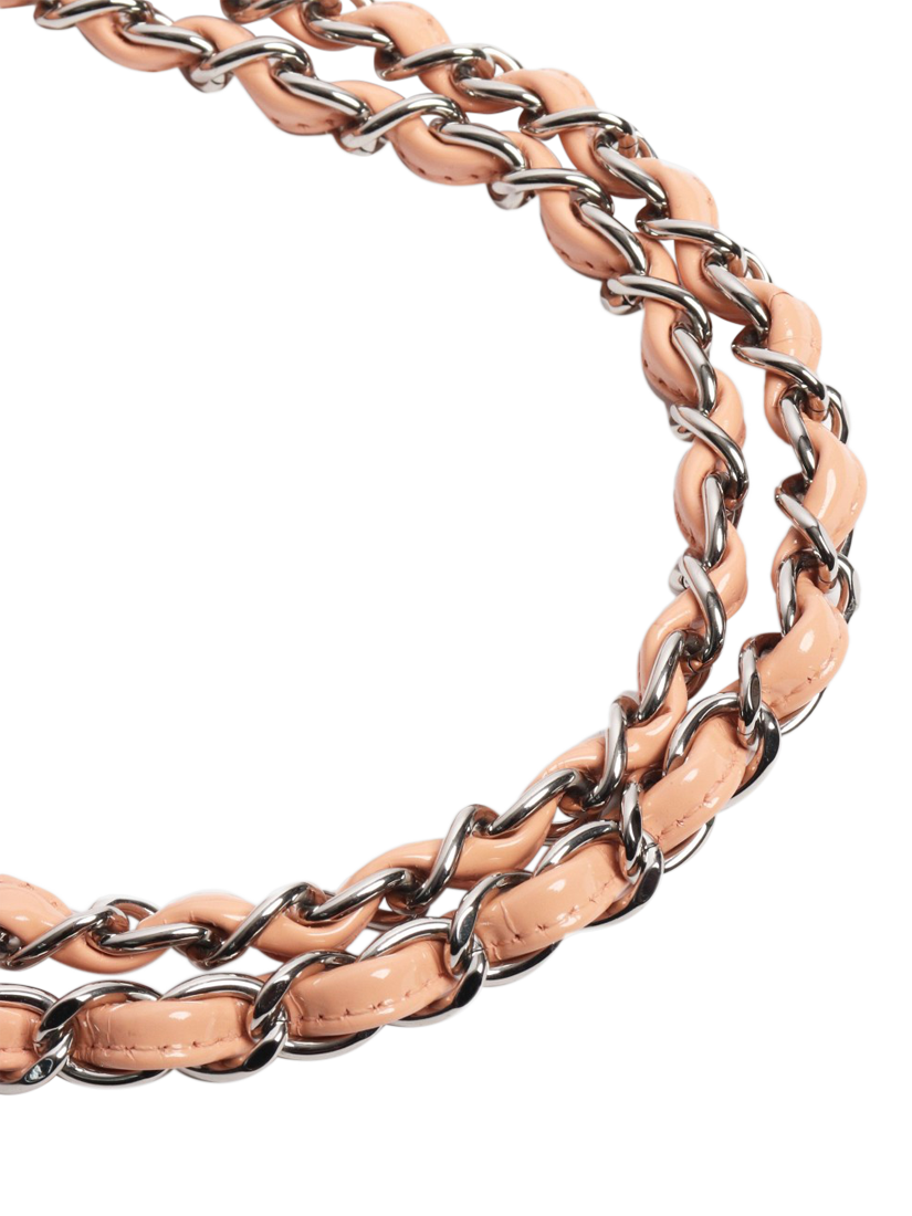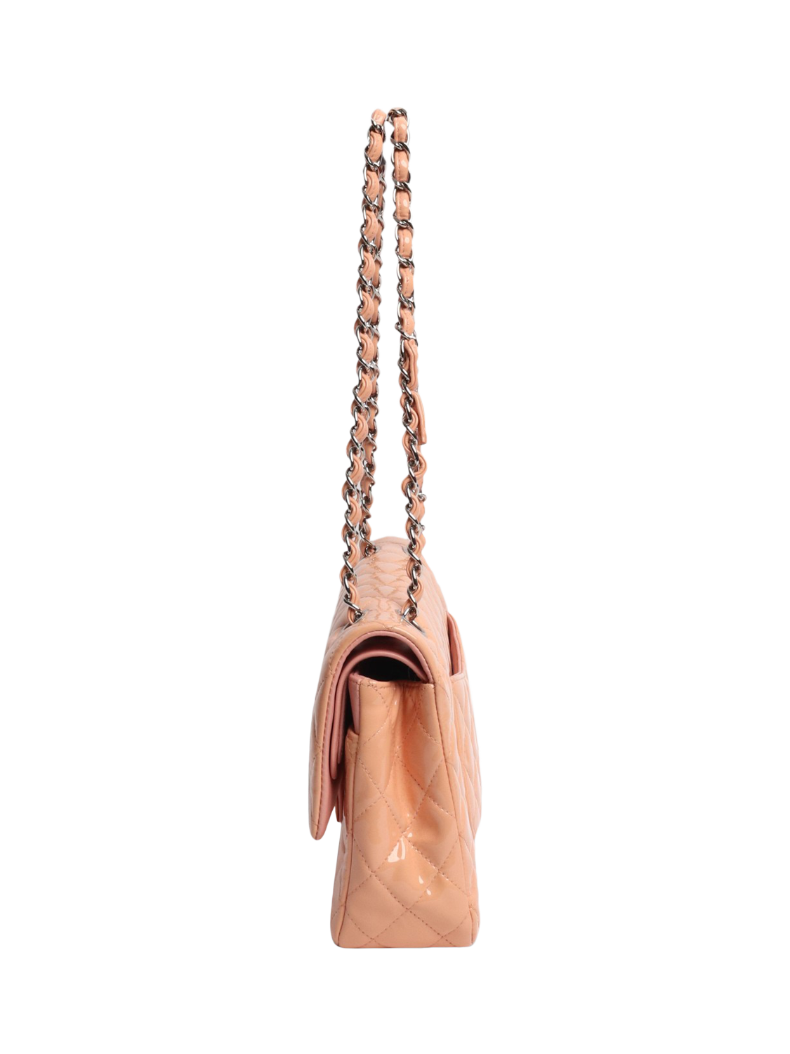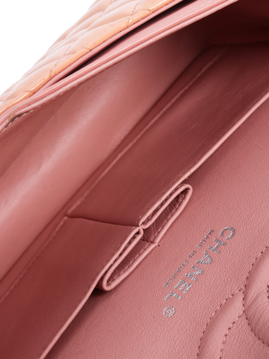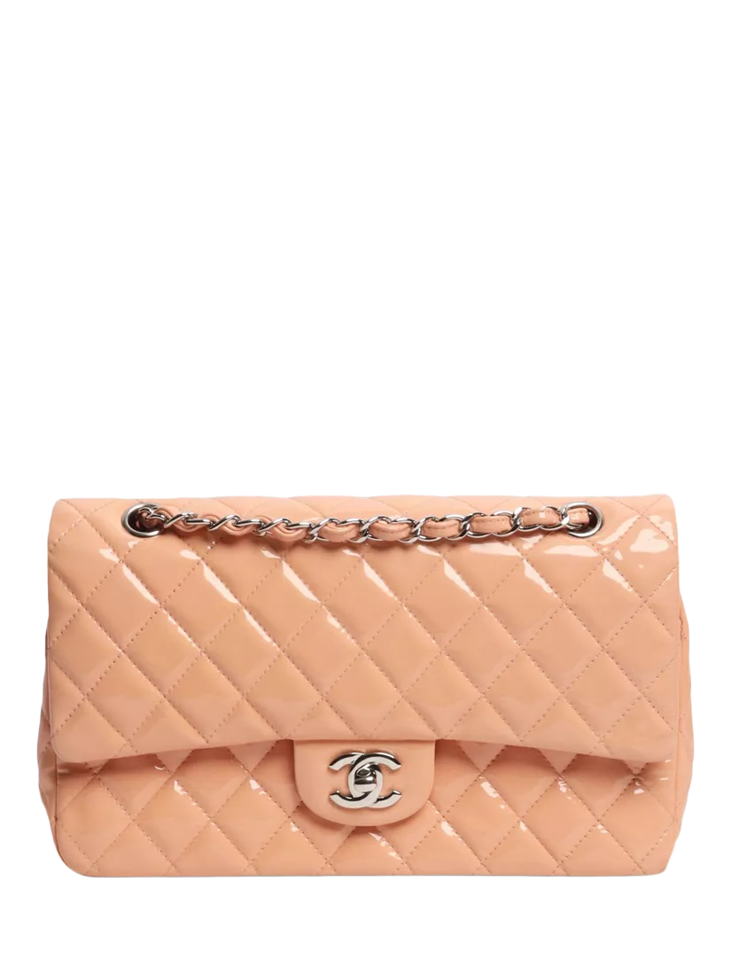 Pre-loved CHANEL peach and pink patent leather double flap bag with silver hardware. This bag has a signature CC turn-lock closure on the flap. The bag has a main compartment with interior patch pockets and a front slip pocket. Concealed zipped pocket on the underside of the flap. Adjustable chain and leather shoulder strap. Outer slip pocket at the rear.
