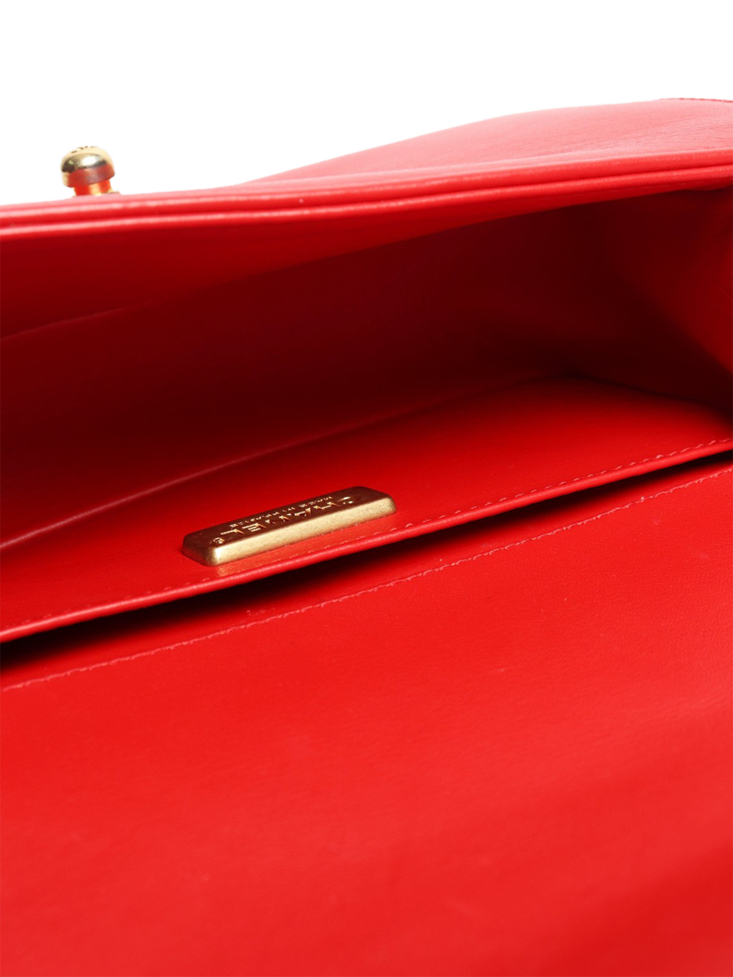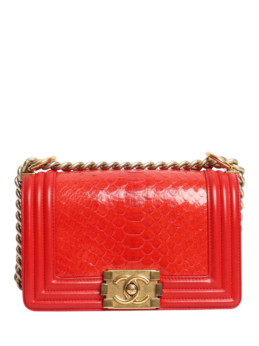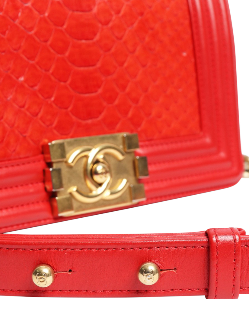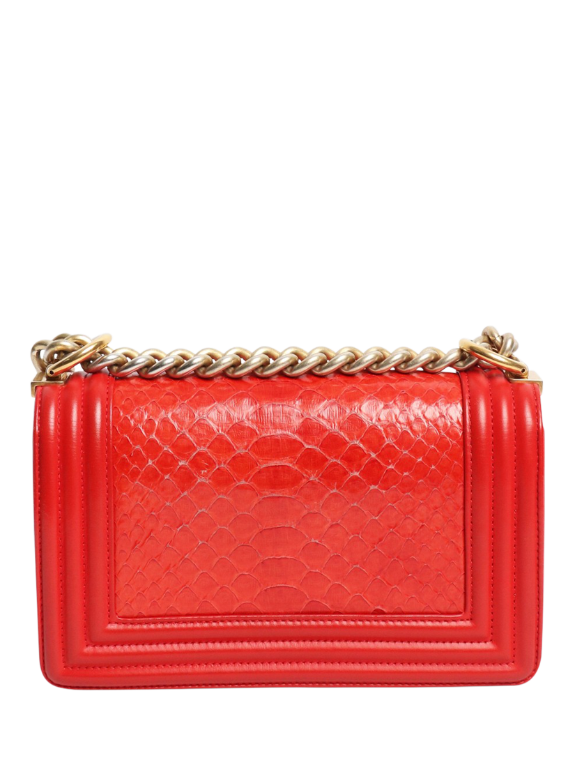 Pre-loved CHANEL red python boy bag with gold hardware. This bag has a sliding chain strap and a main compartment with interior zipped and patch pockets. Signature Boy push-lock closure on the flap.