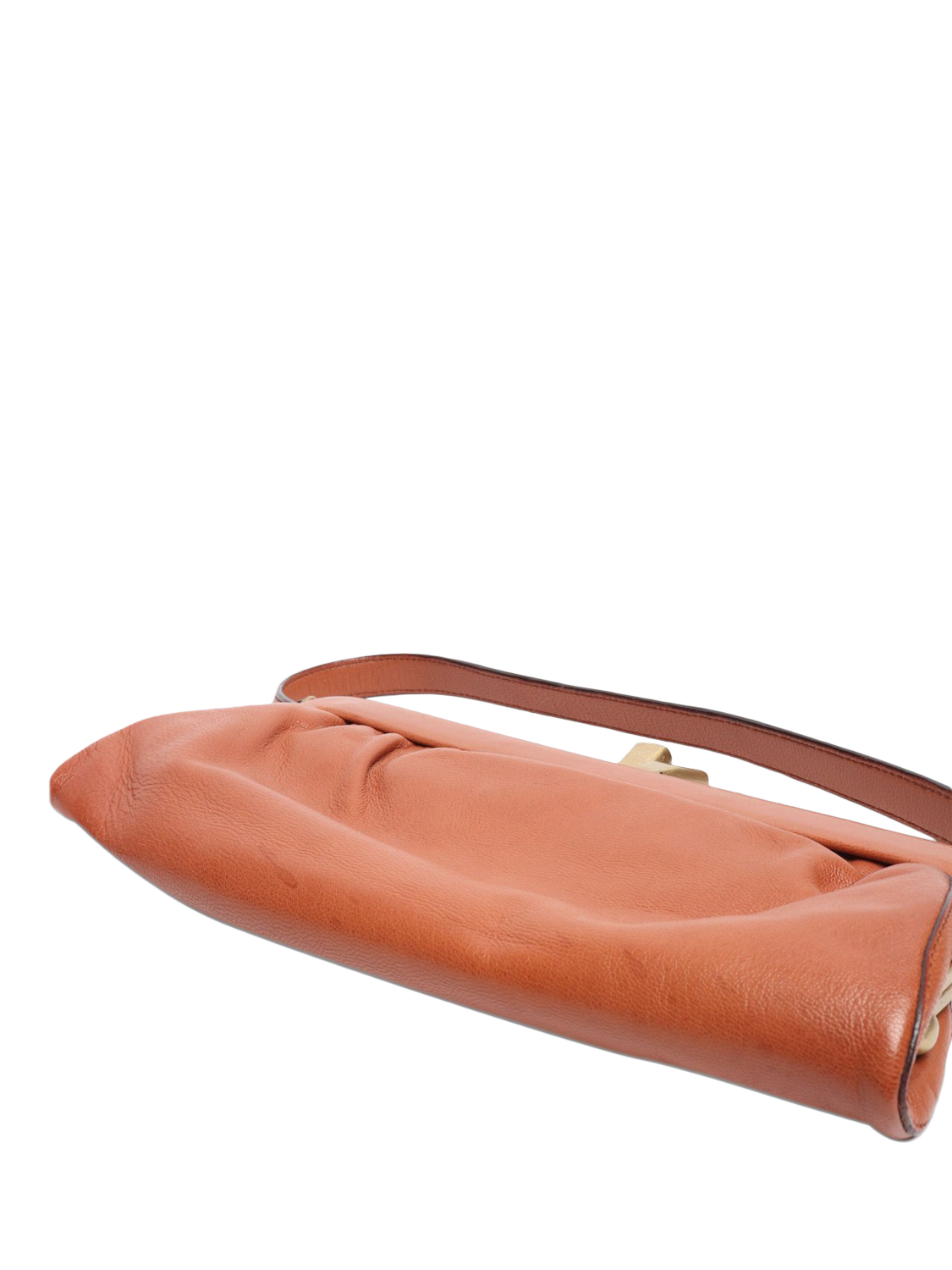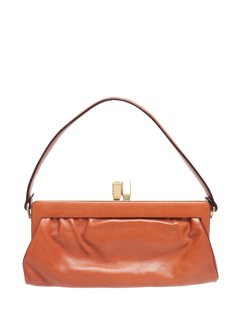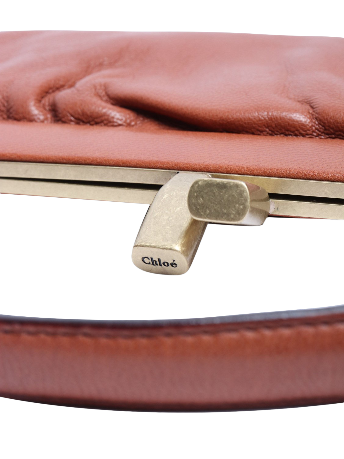 Pre-loved Chloé tan leather mini bag with gold hardware. This bag has a kiss-lock closure and a main compartment with an interior zipped pocket.