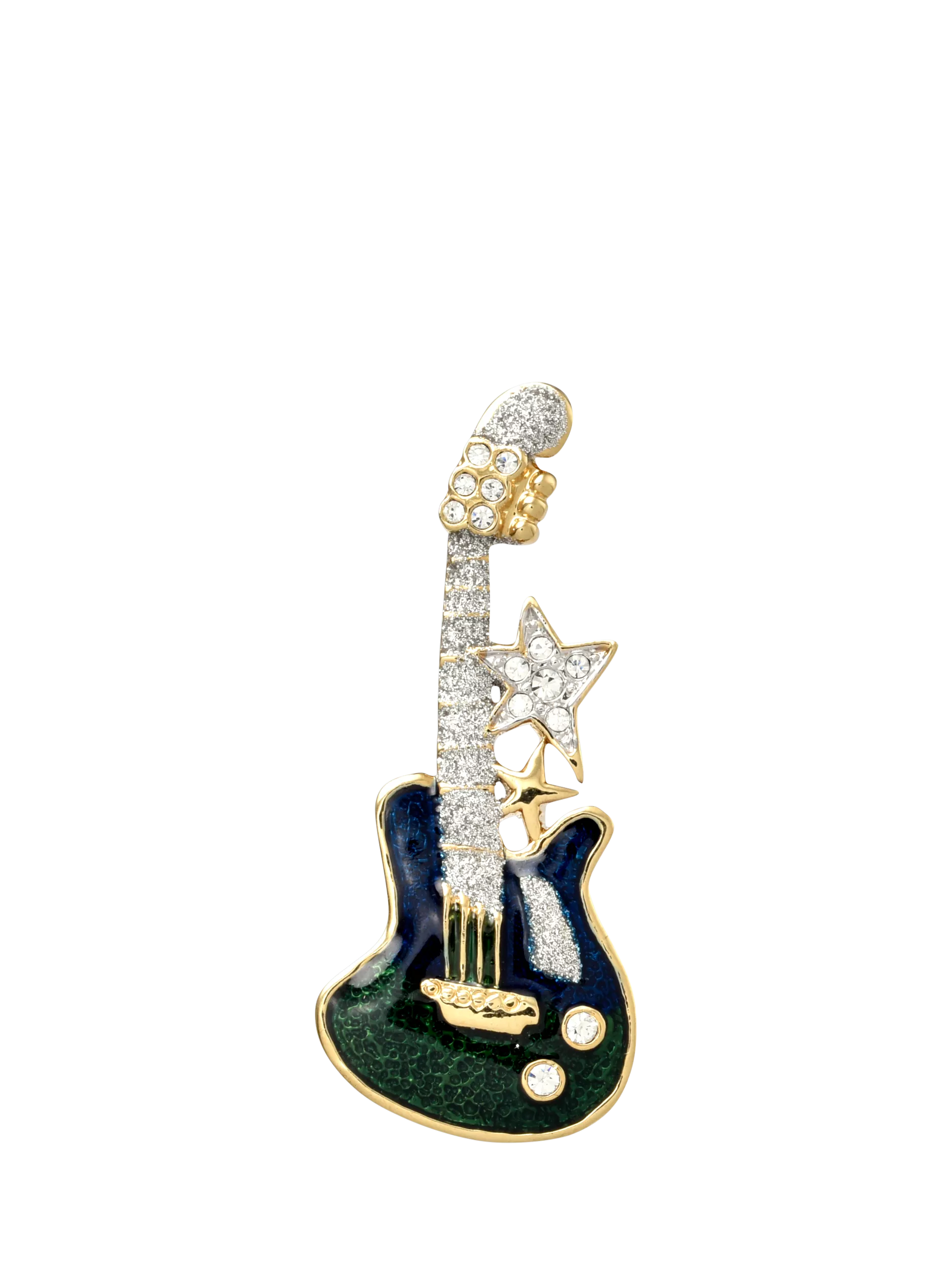 Pre-loved guitar brooch in blue, green and silver enamel, embellished with clear crystals and set in 18ct gold plate. Circa 1980s. Presented by Eclectica in a branded gift box.