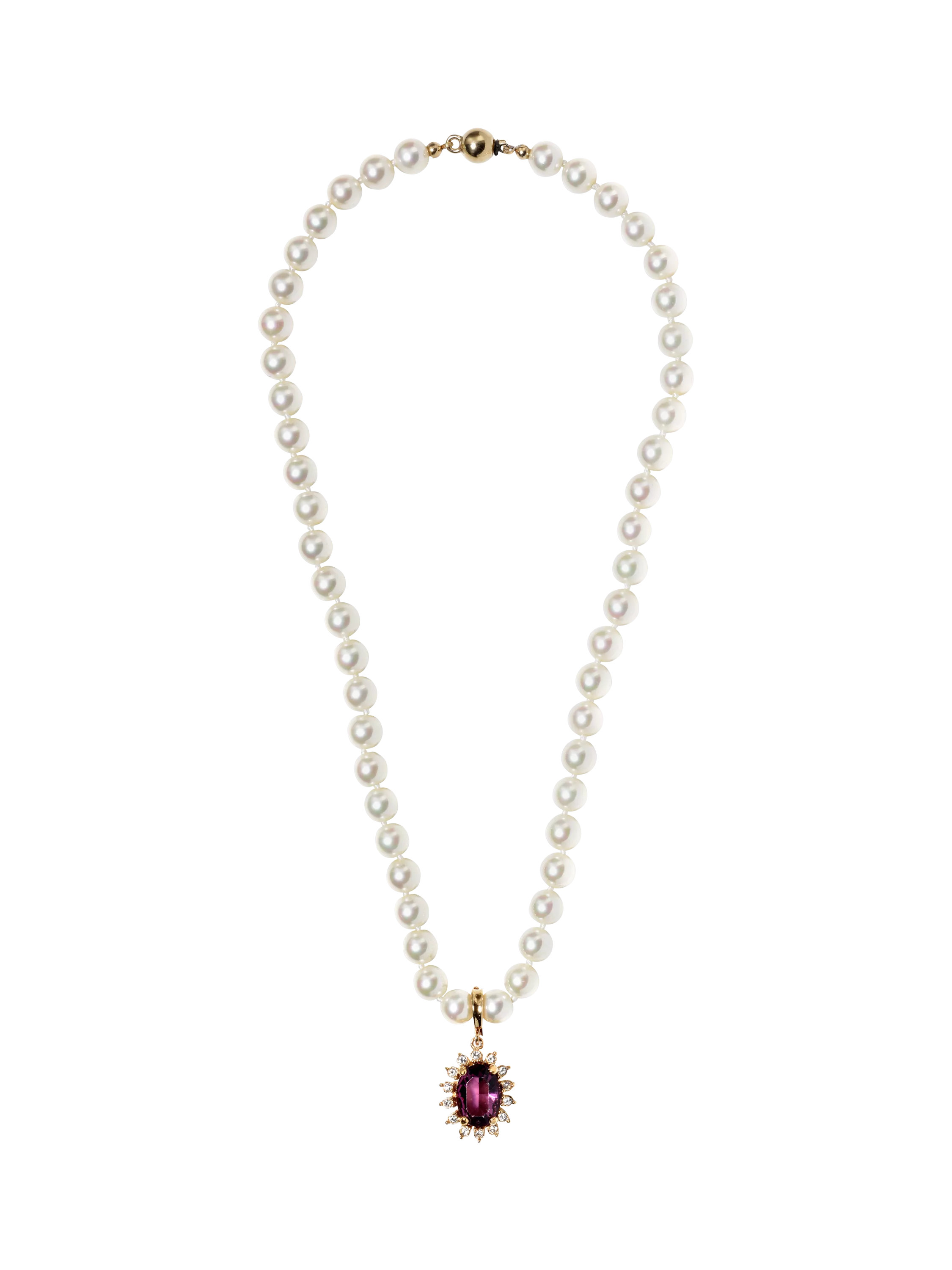 Pre-loved detachable clear and Amethyst crystal 18ct gold-plated pendant, showcased on faux pearls with gold-plated clasp from the 1980s. The pendant measures 1.5 x 3.5cm, including the bail. Presented by Eclectica in a branded gift box.
