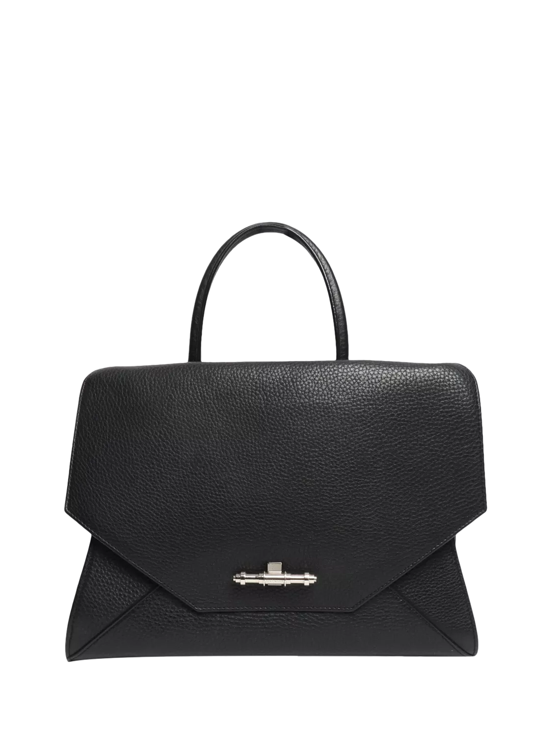 Pre-loved Givenchy black Obsedia leather 2-way tote bag with silver hardware. This bag has two handles and comes with a removable strap. This bag has a flap pocket at the front, and a main compartment with interior zipped and slip pockets.