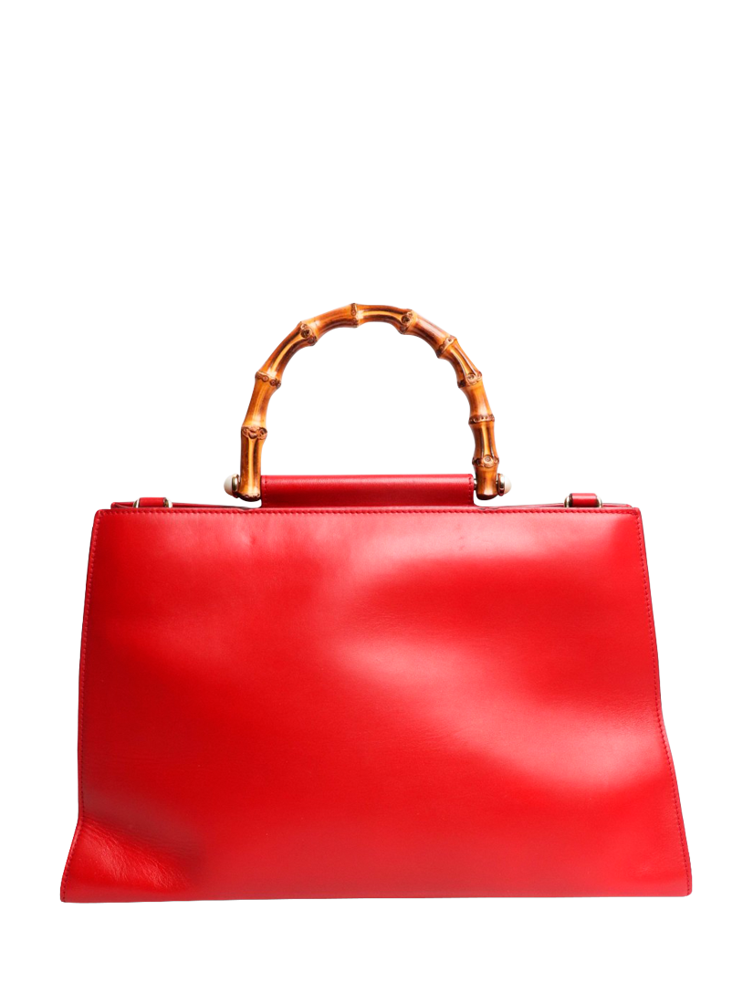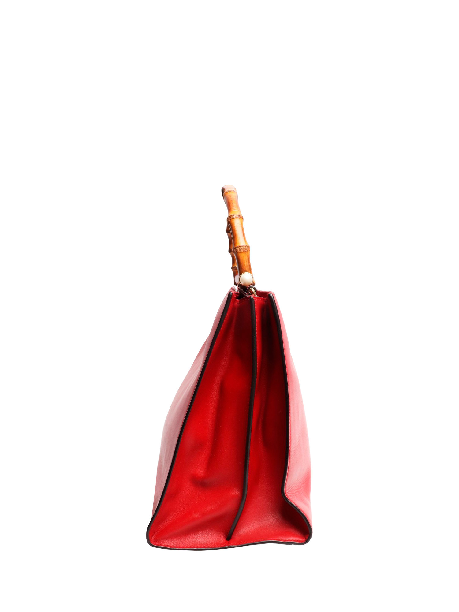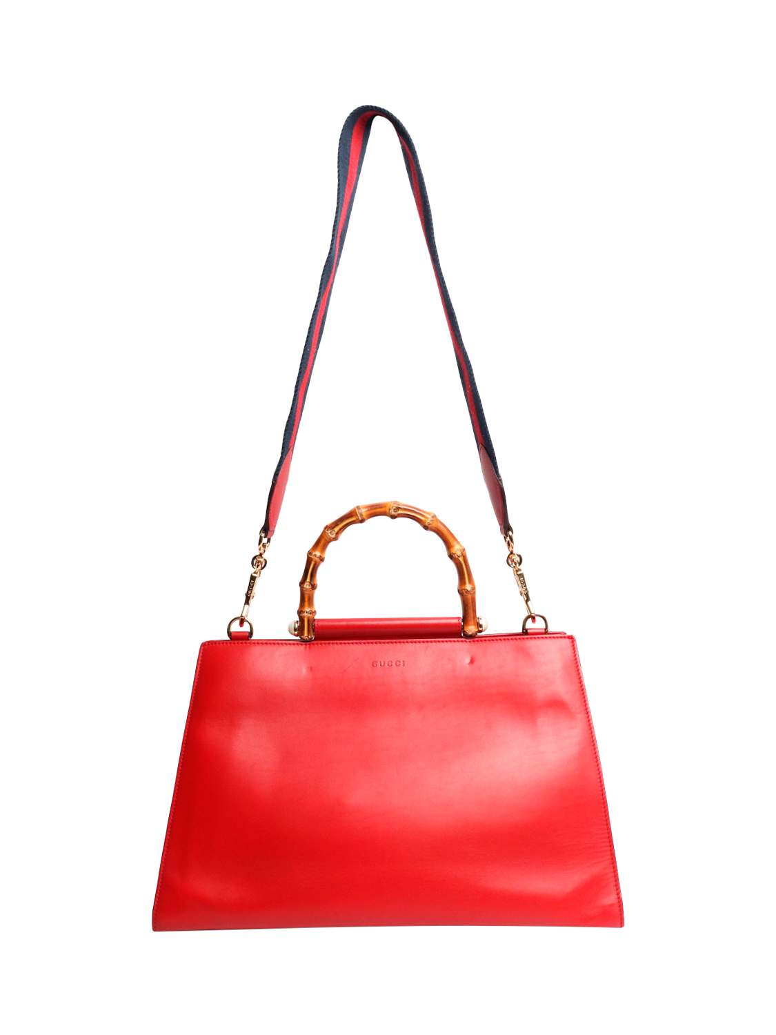 Pre-loved GUCCI red bamboo top handle bag with gold hardware. This bag comes with a removable web-stripe shoulder strap. This bag has a partitioned compartment with interior zipped and patch pockets.