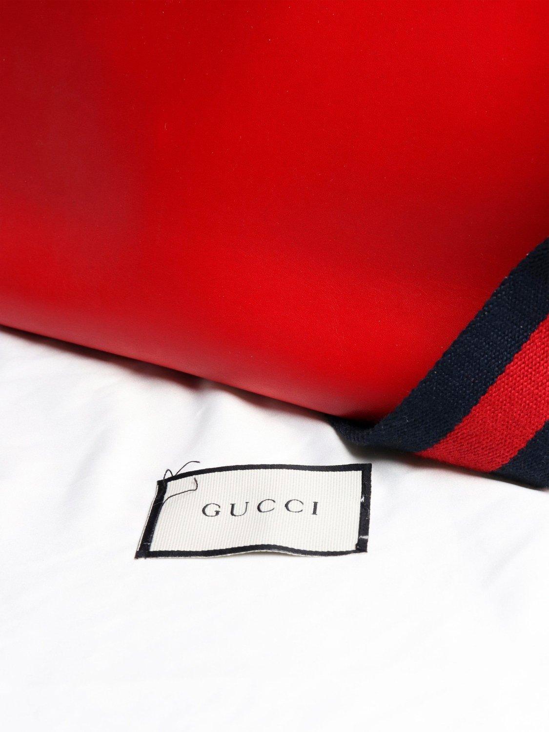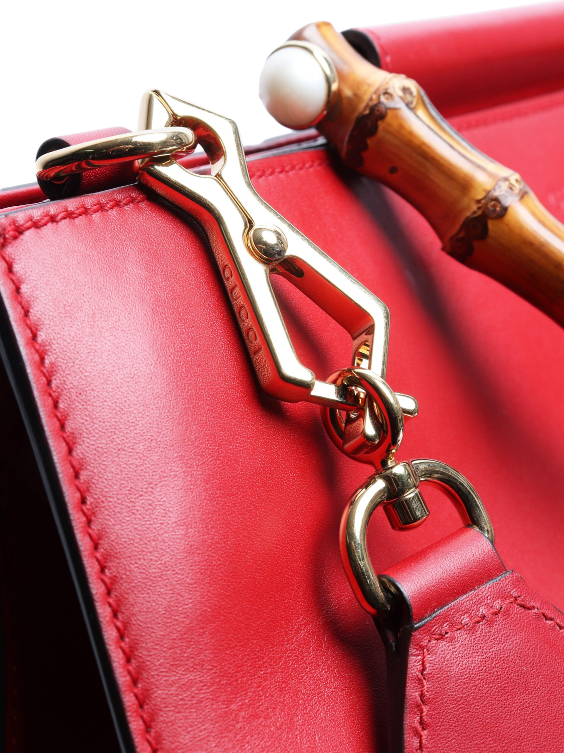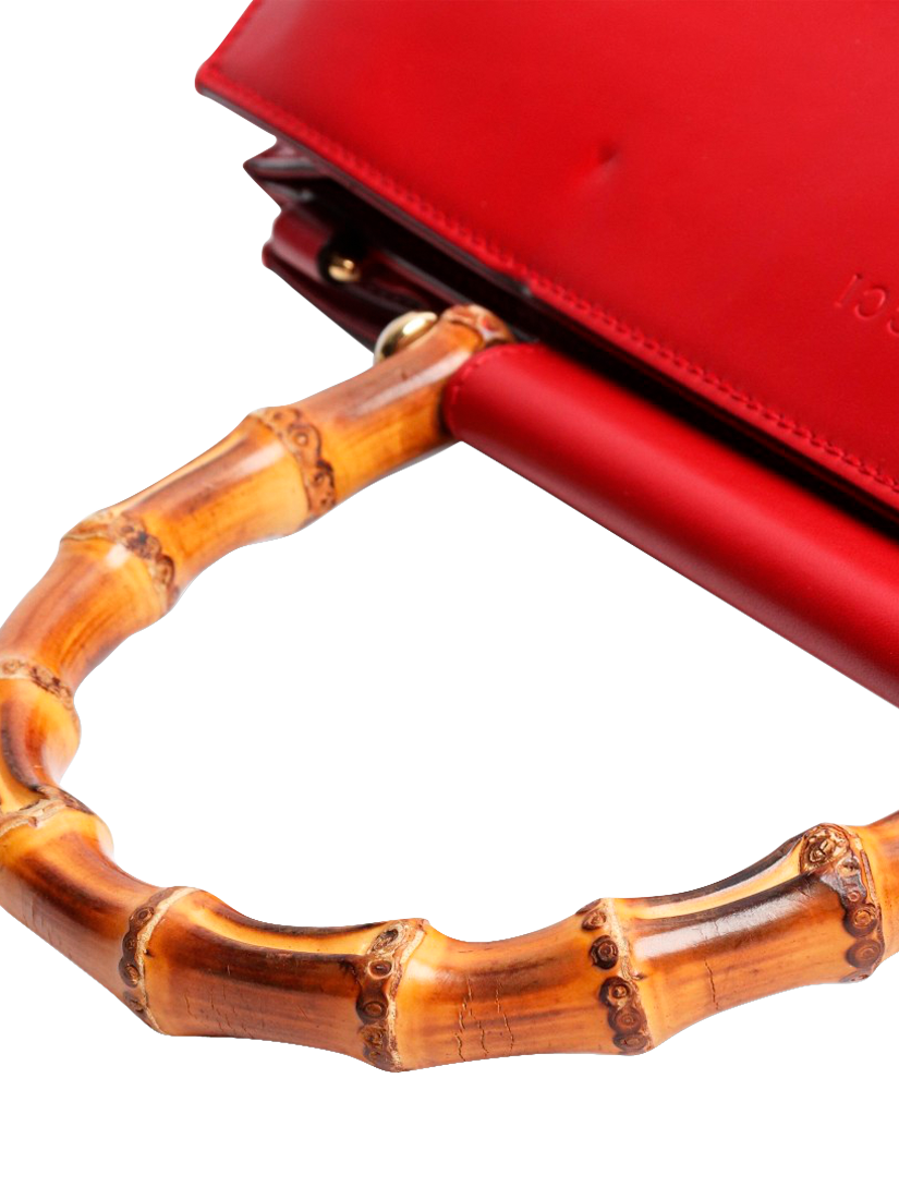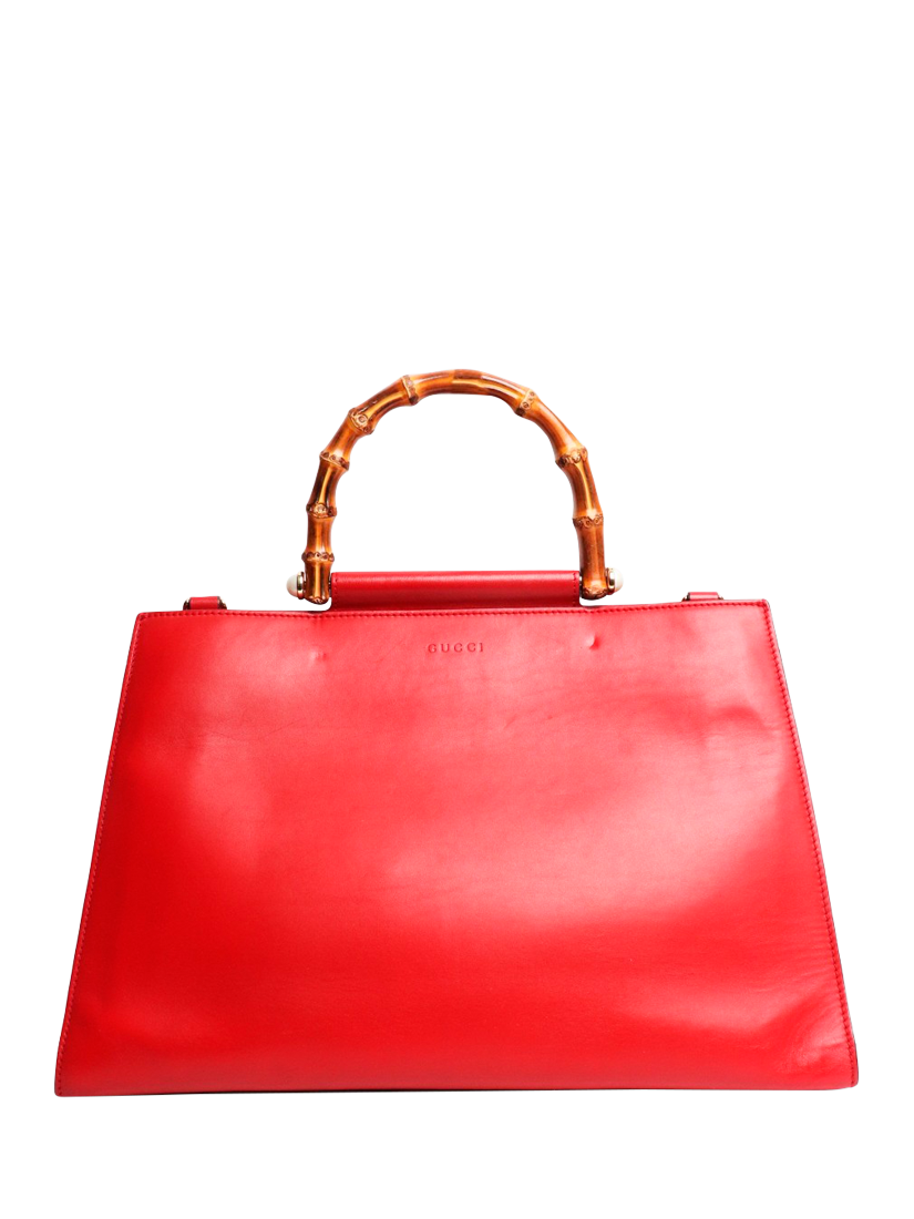 Pre-loved GUCCI red bamboo top handle bag with gold hardware. This bag comes with a removable web-stripe shoulder strap. This bag has a partitioned compartment with interior zipped and patch pockets.
