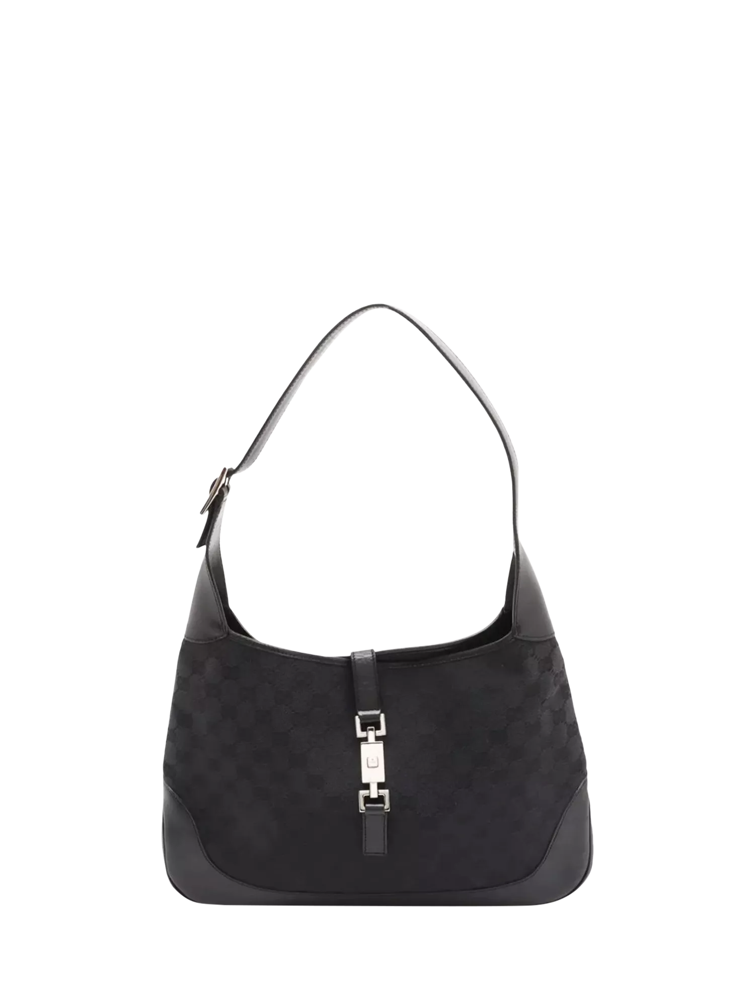 Pre-loved GUCCI black GG canvas Jackie bag with silver hardware. This bag has a main compartment with an interior zipped pocket and a signature Jackie clasp closure at the front.