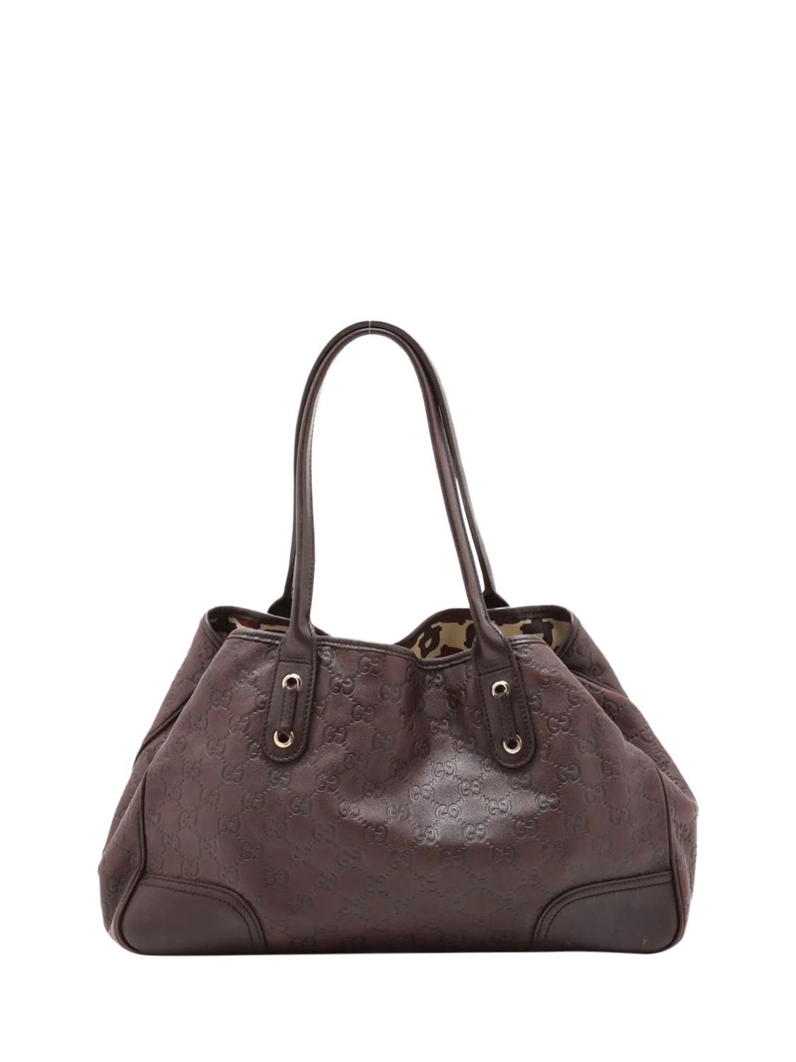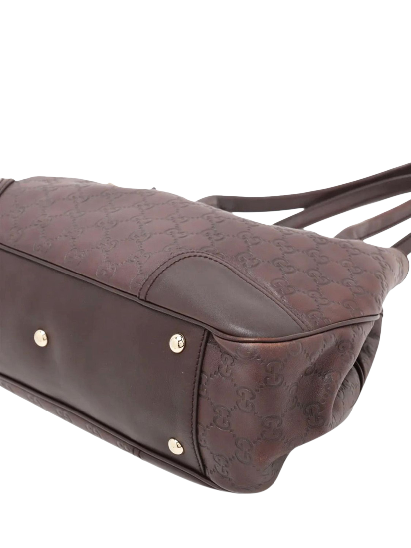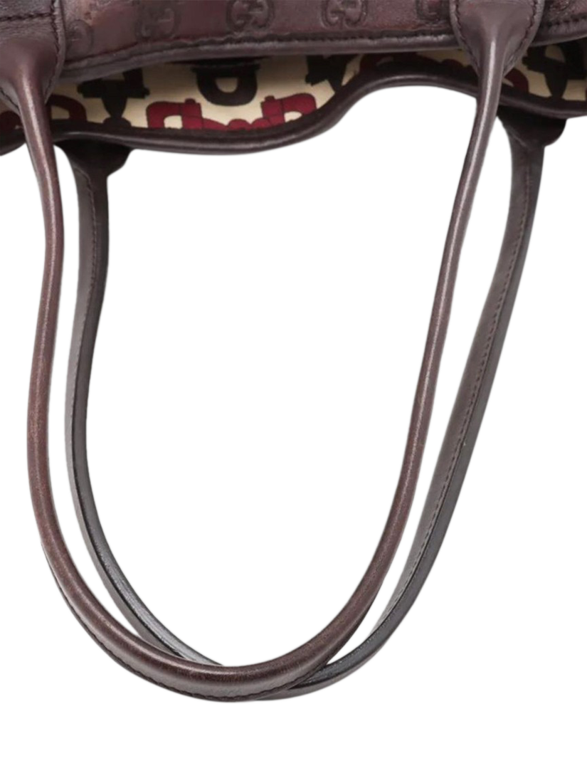 Pre-loved GUCCI brown GG leather shoulder bag with gold hardware. This bag features contrast-stitching and web-stripe accents around the bag. The bag has two handles an open top, and a spacious compartment with interior zipped and patch pockets.