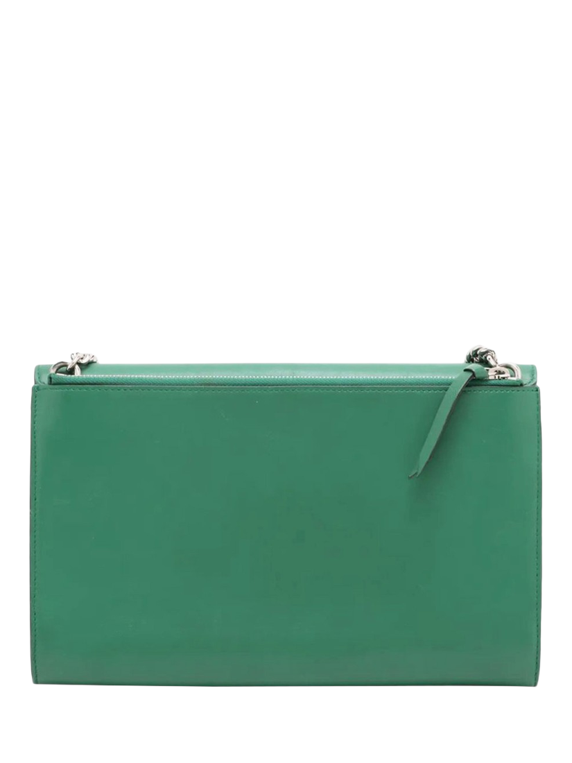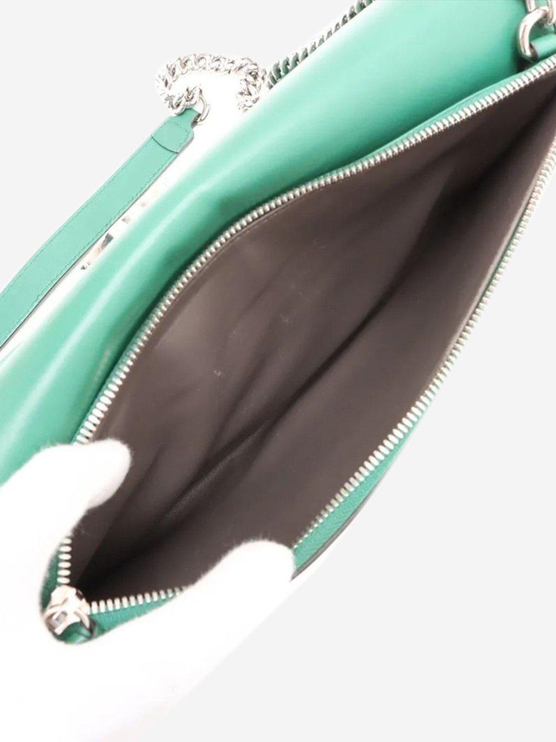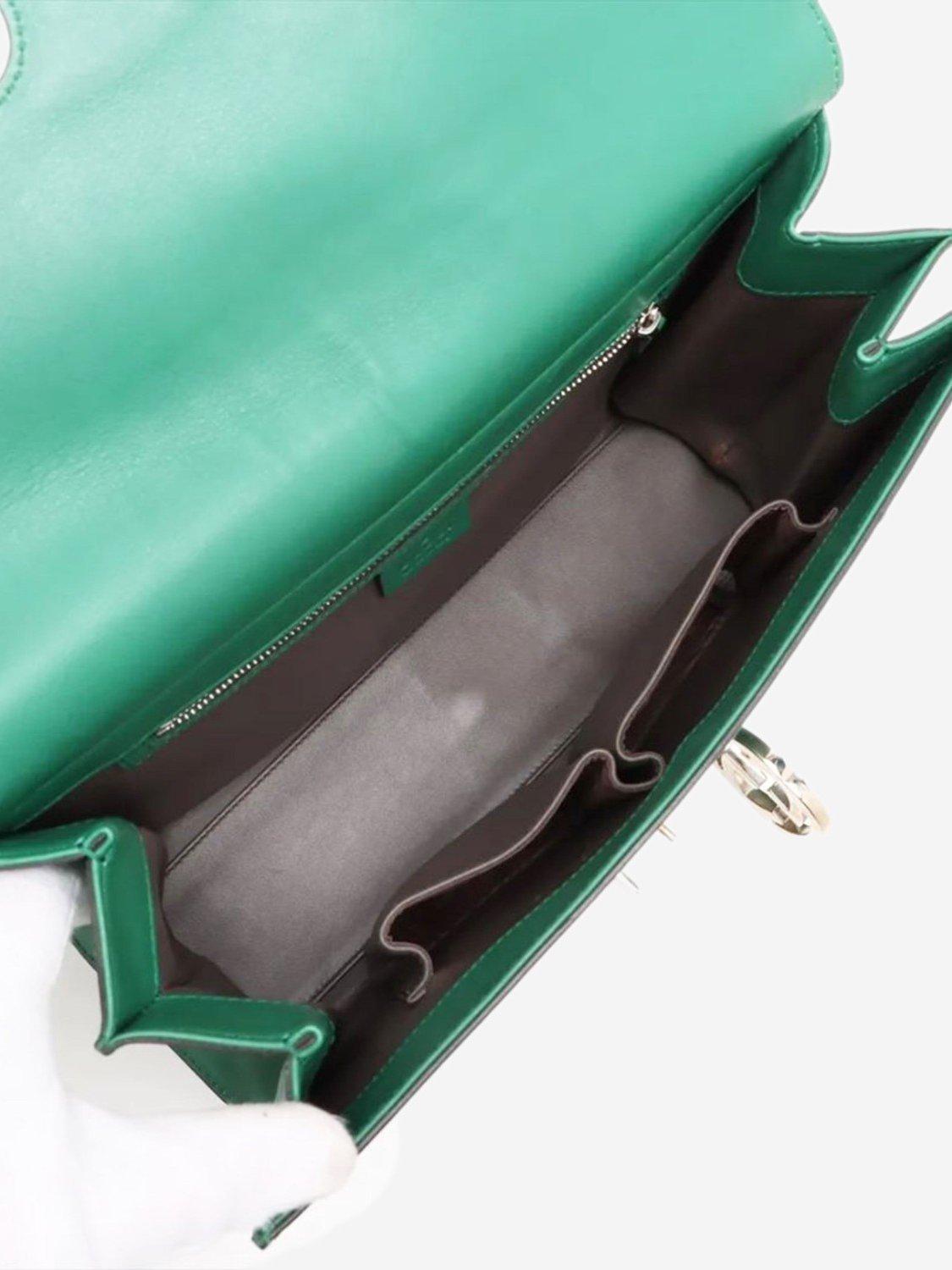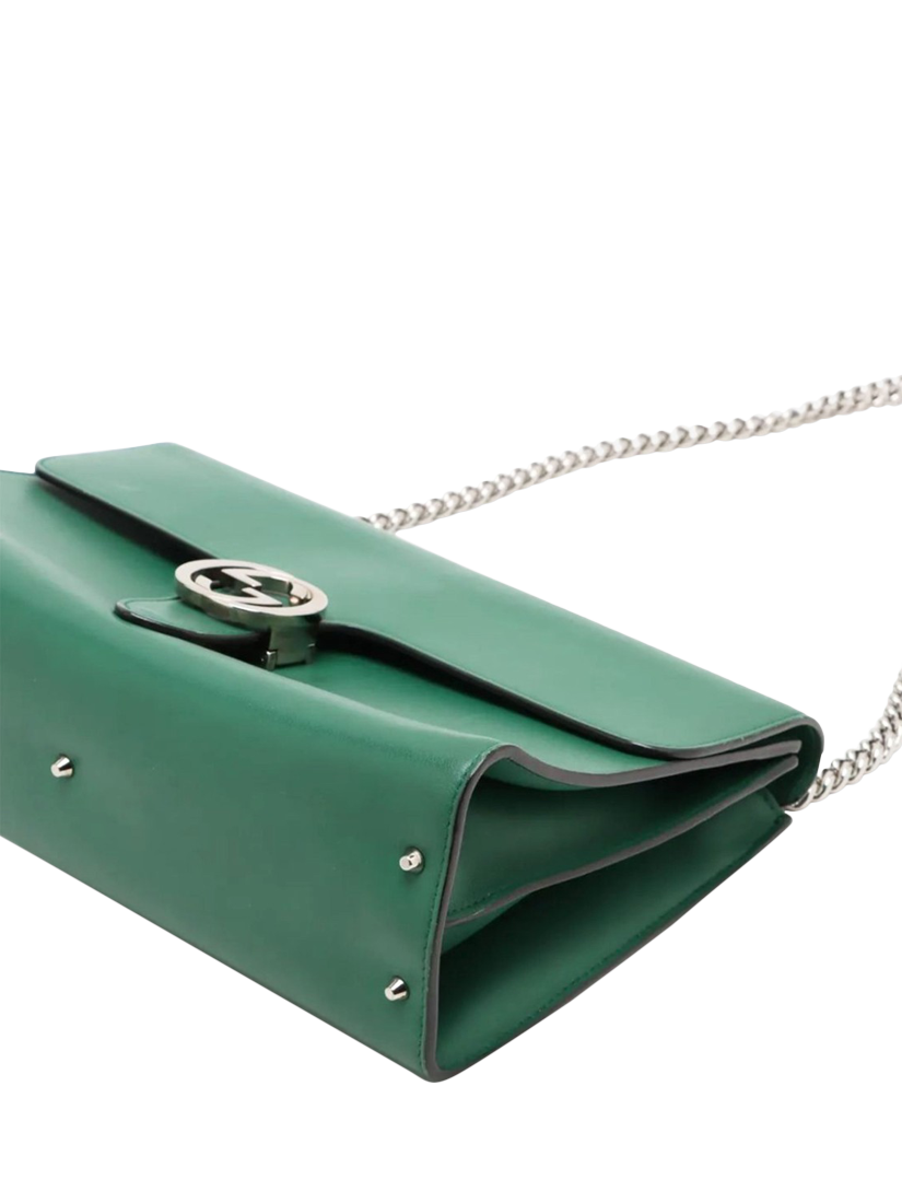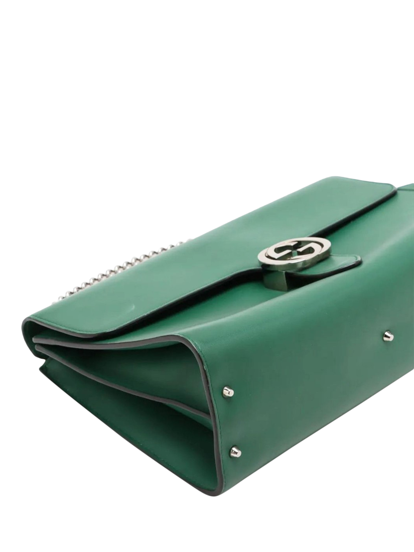 Pre-loved GUCCI green Interlocking G leather chain shoulder bag with silver hardware. This bag has a turn-lock closure on the flap. The bag has a main compartment with interior zipped and patch pockets. Outer zipped pocket at the rear.