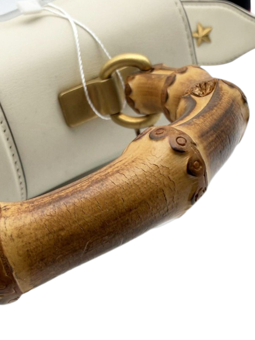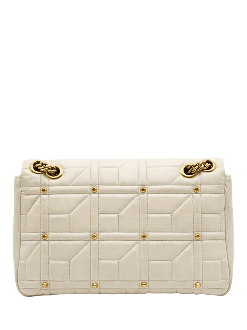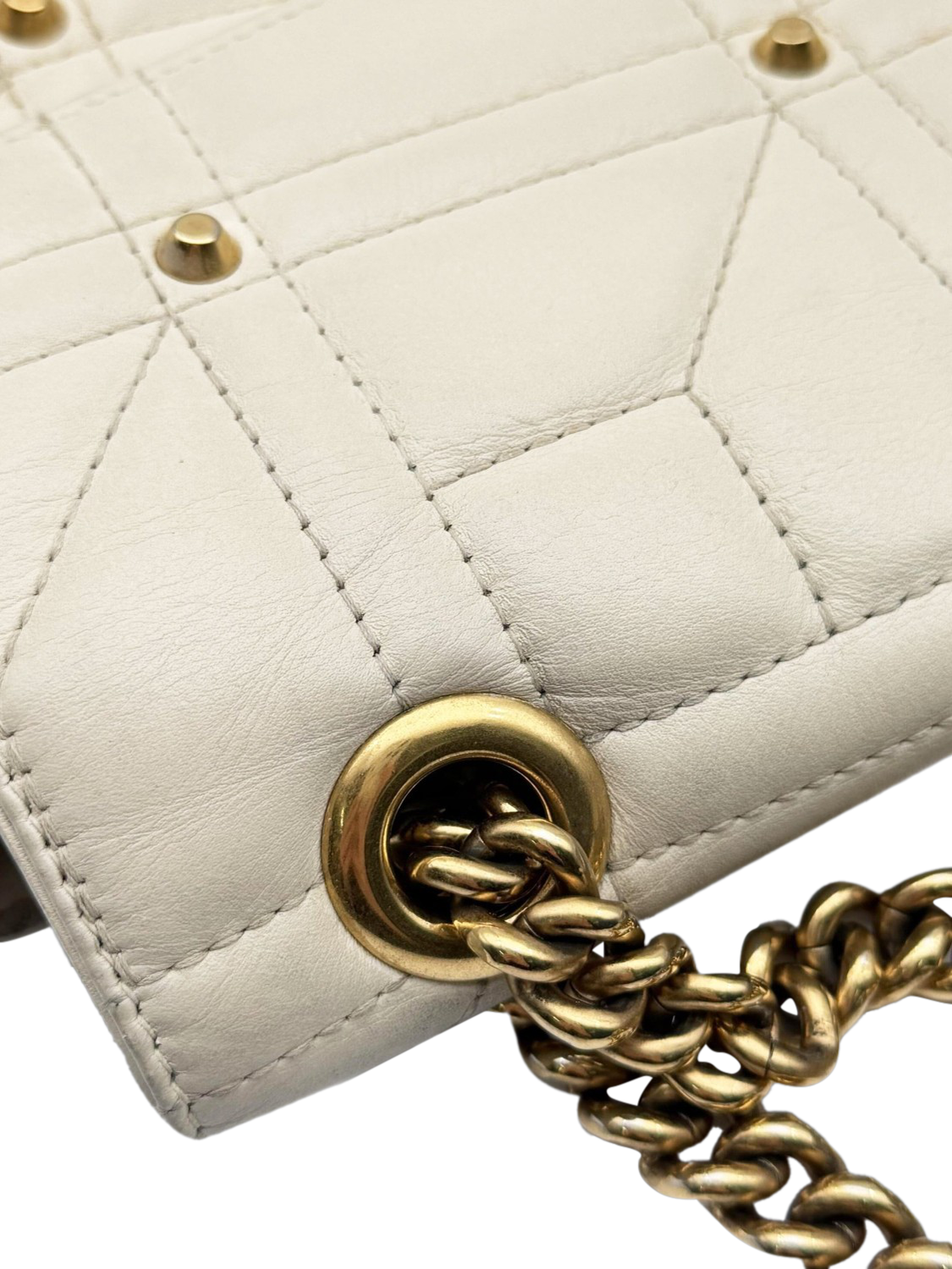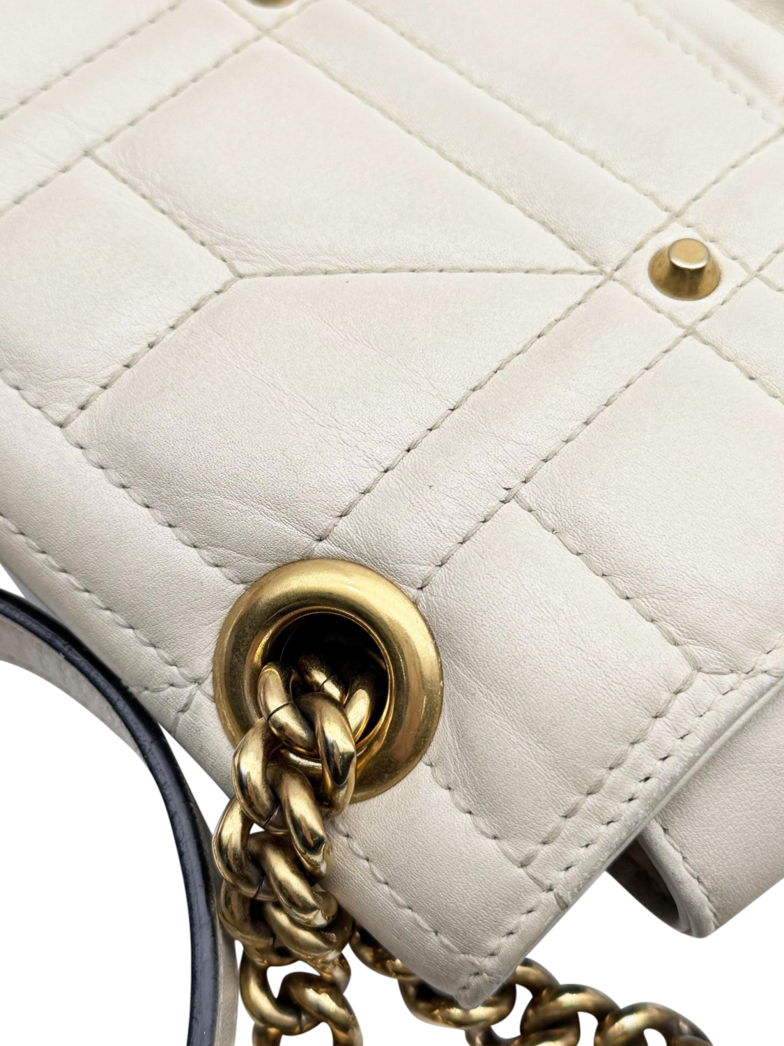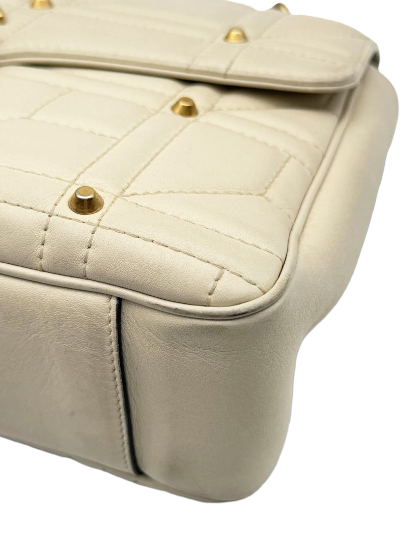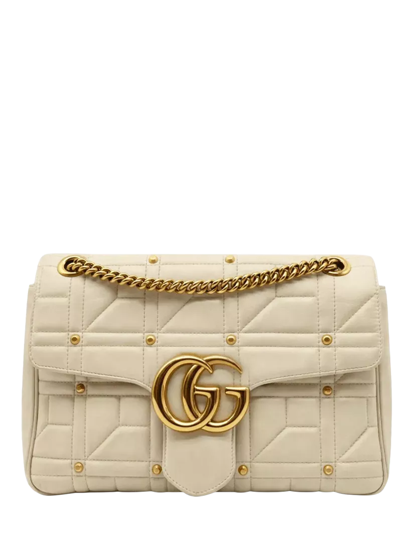 Pre-loved GUCCI cream medium leather GG Marmont quilted shoulder bag with stud detail and a flap spring closure featuring Double G hardware. The bag has a sliding chain strap that can be worn as a shoulder and top handle bag. The main compartment features an interior zipped pocket.
