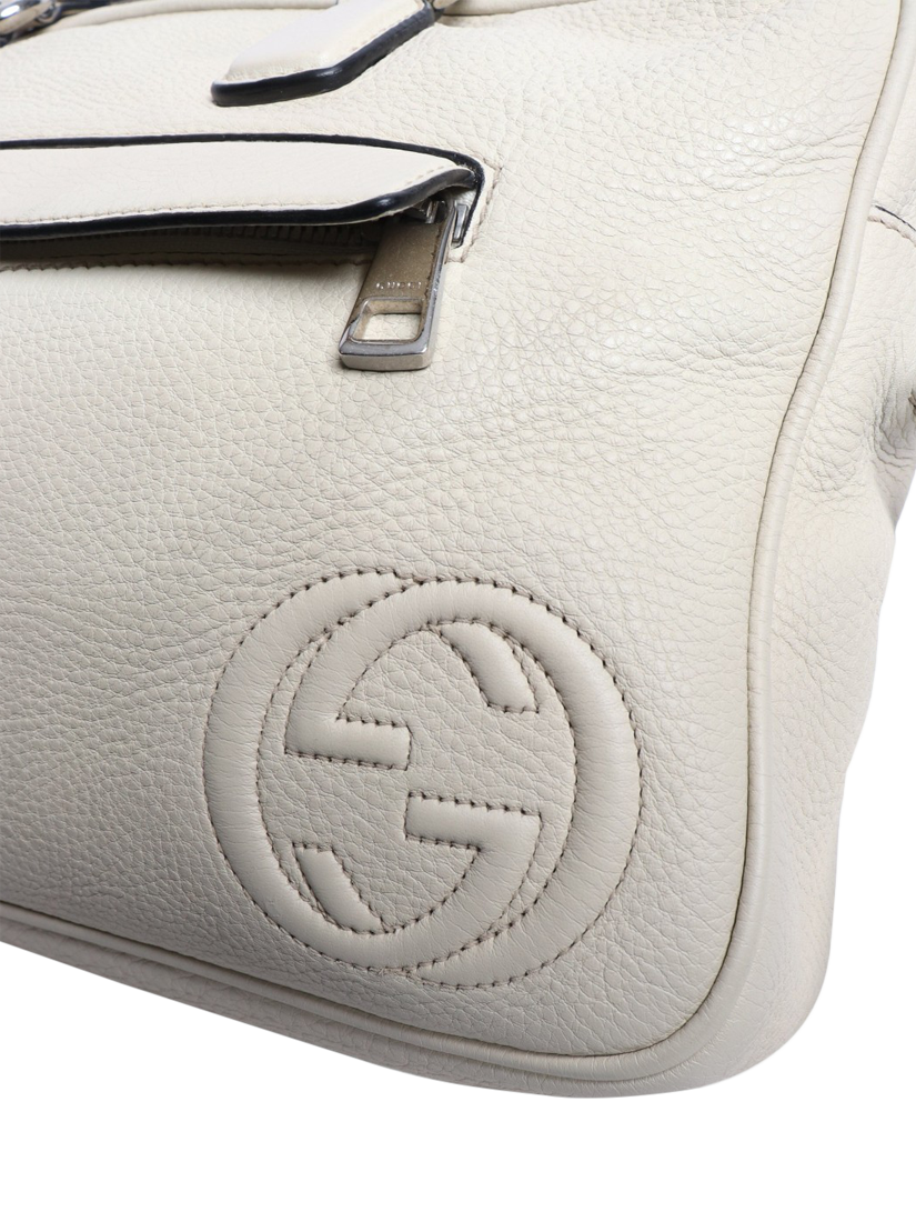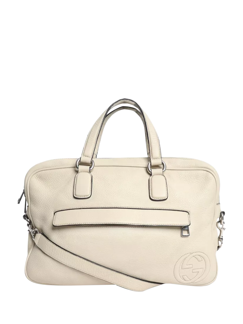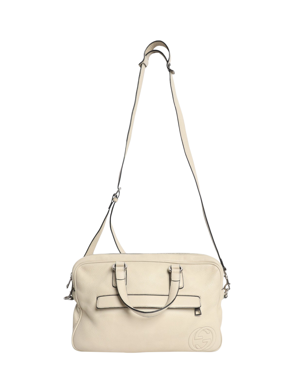 Pre-loved GUCCI neutral Soho briefcase with silver hardware. This bag has a main compartment, two slip pockets, and one zipped pocket. Comes with a detachable shoulder strap.