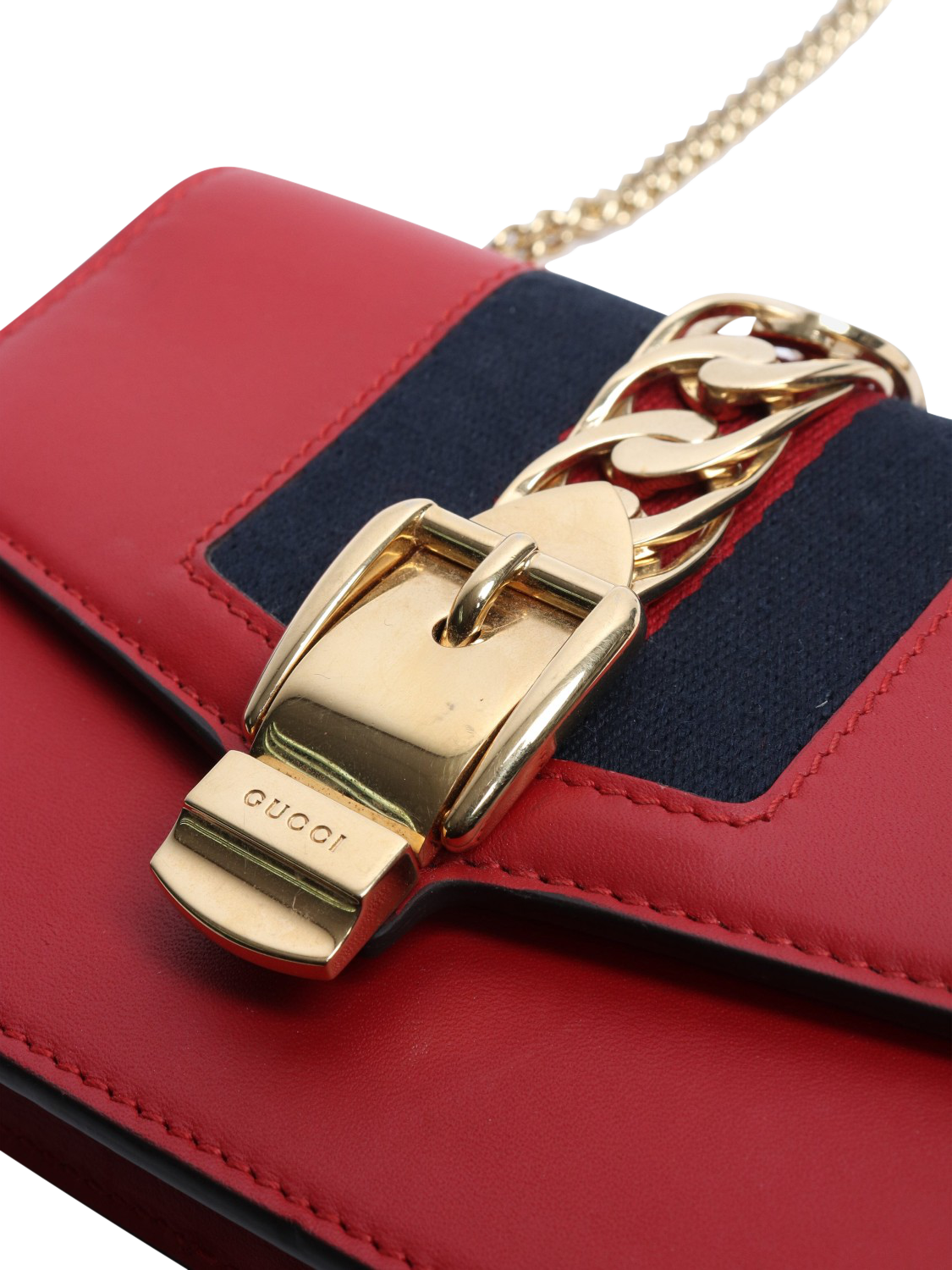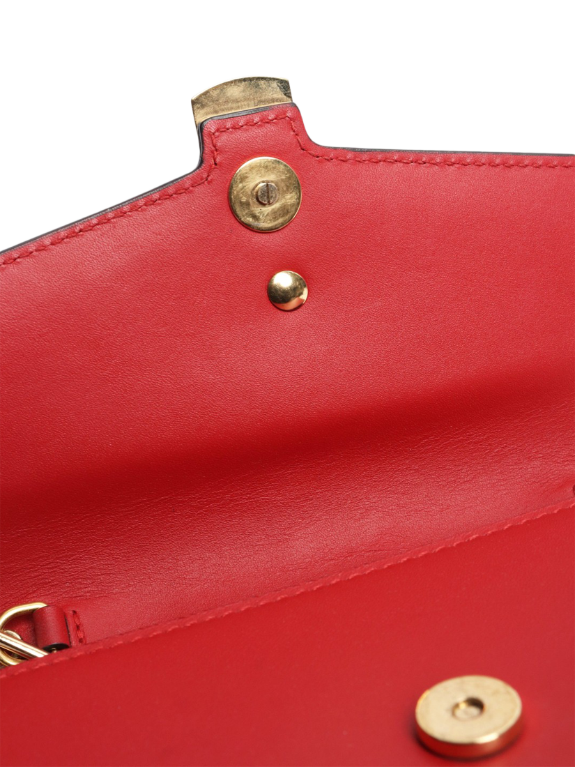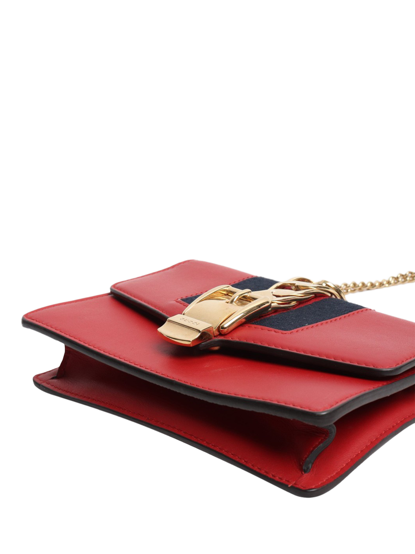 Pre-loved GUCCI red Sylvie super mini chain bag with gold hardware and a snap-button closure. This bag has a single compartment.