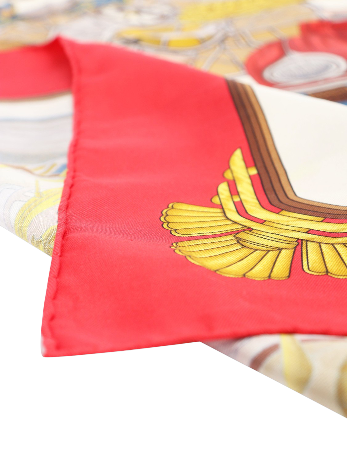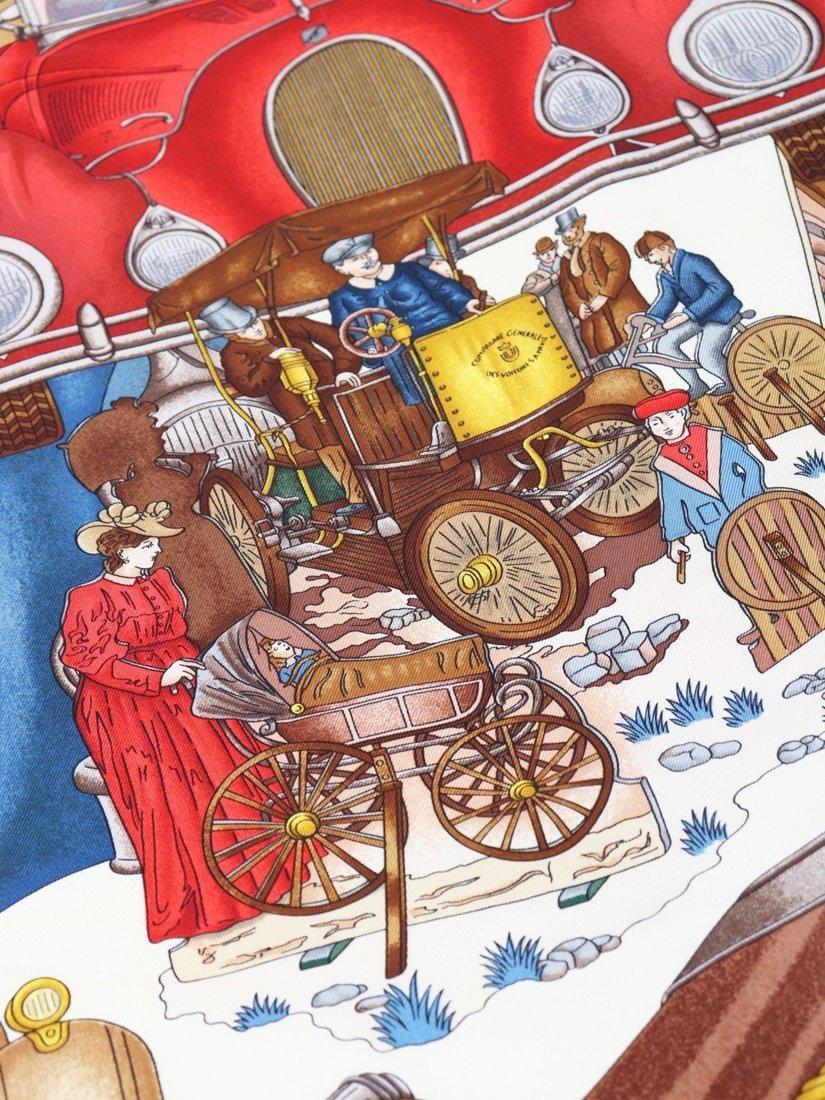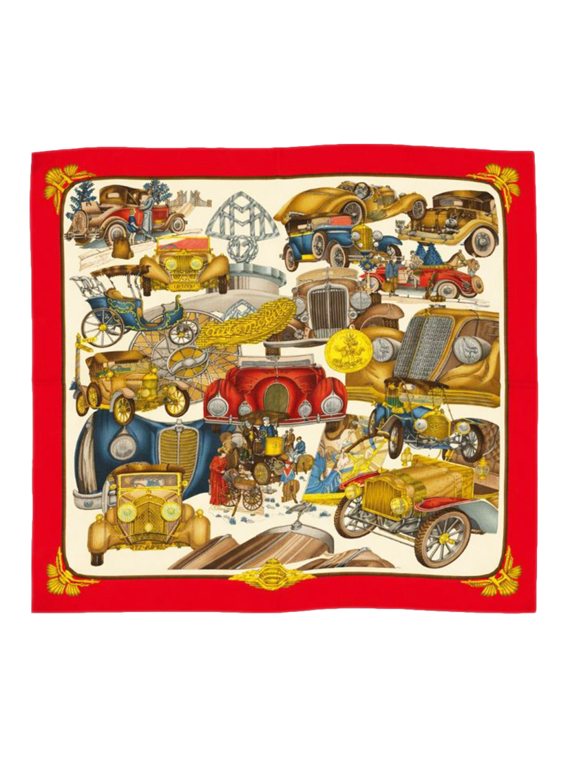 Pre-loved Hermès red automobile silk scarf. This item is in very good pre-owned condition, showing no significant signs of wear.