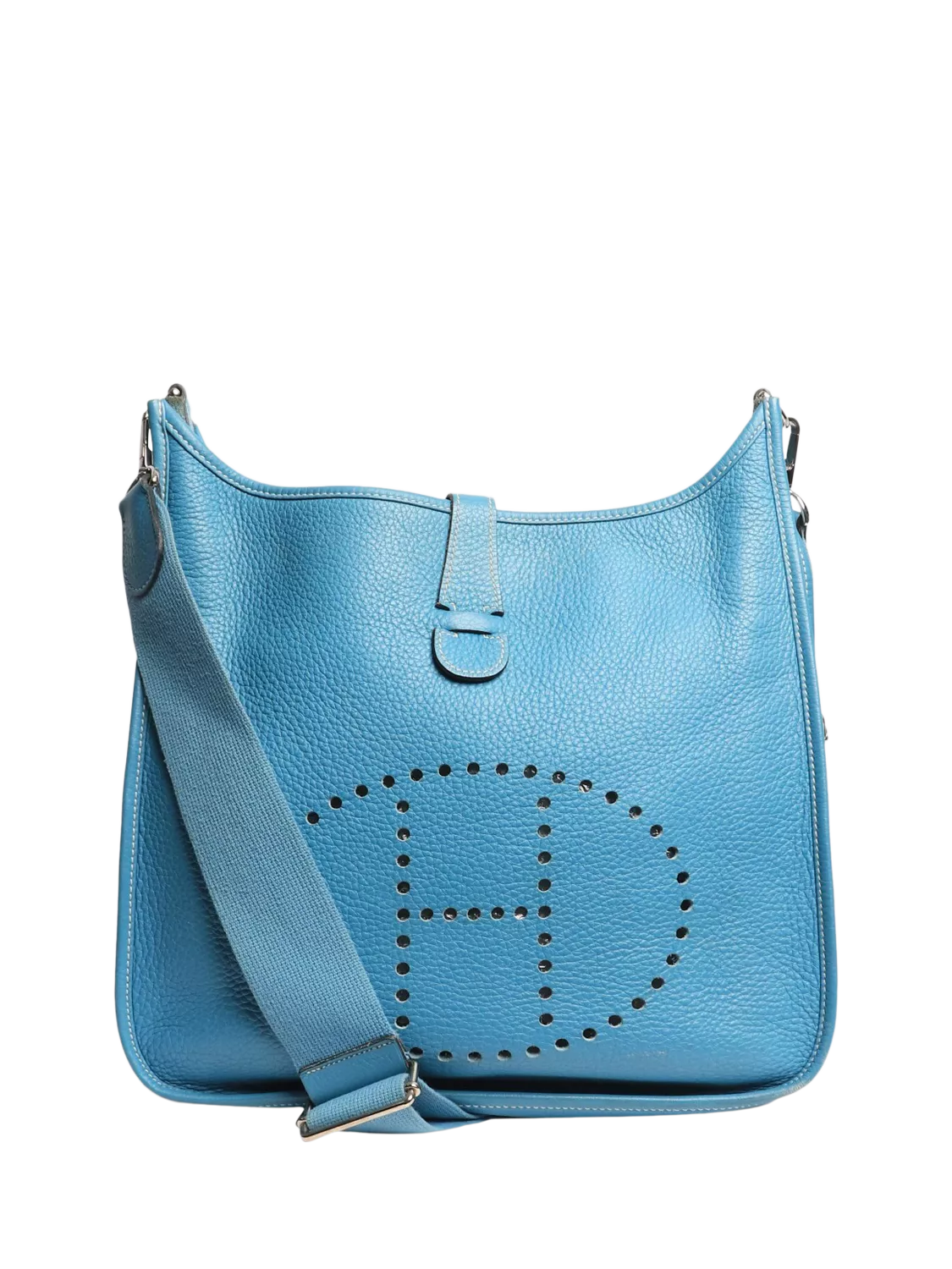Pre-loved Hermès bleu jean Evelyne PM bag in Clemence leather with silver hardware. This bag has a removable shoulder strap and a main compartment with a snap-closure tab. Outer slip pocket at the rear. Signature H cutout branding on the front.