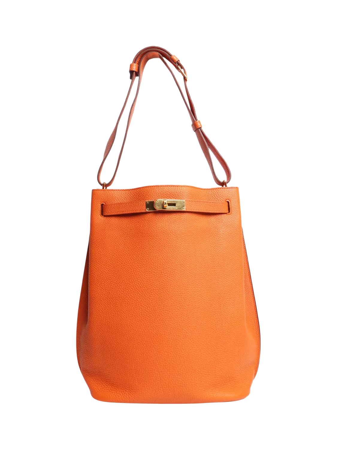 Pre-loved Hermès orange 2011 So Kelly shoulder bag in Togo leather with gold hardware. This bag features a signature Kelly turn-lock closure at the front. Adjustable shoulder strap. Main compartment with interior zipped and patch pockets.