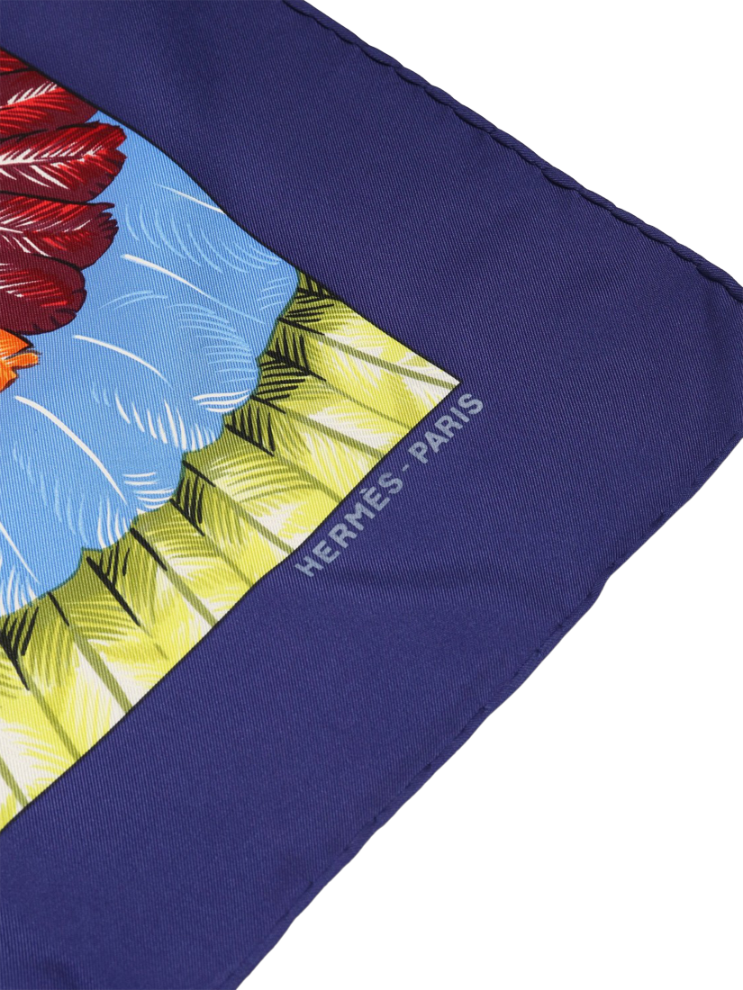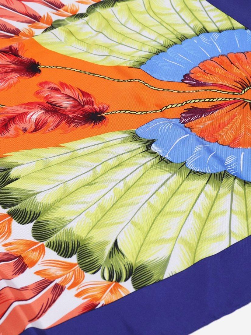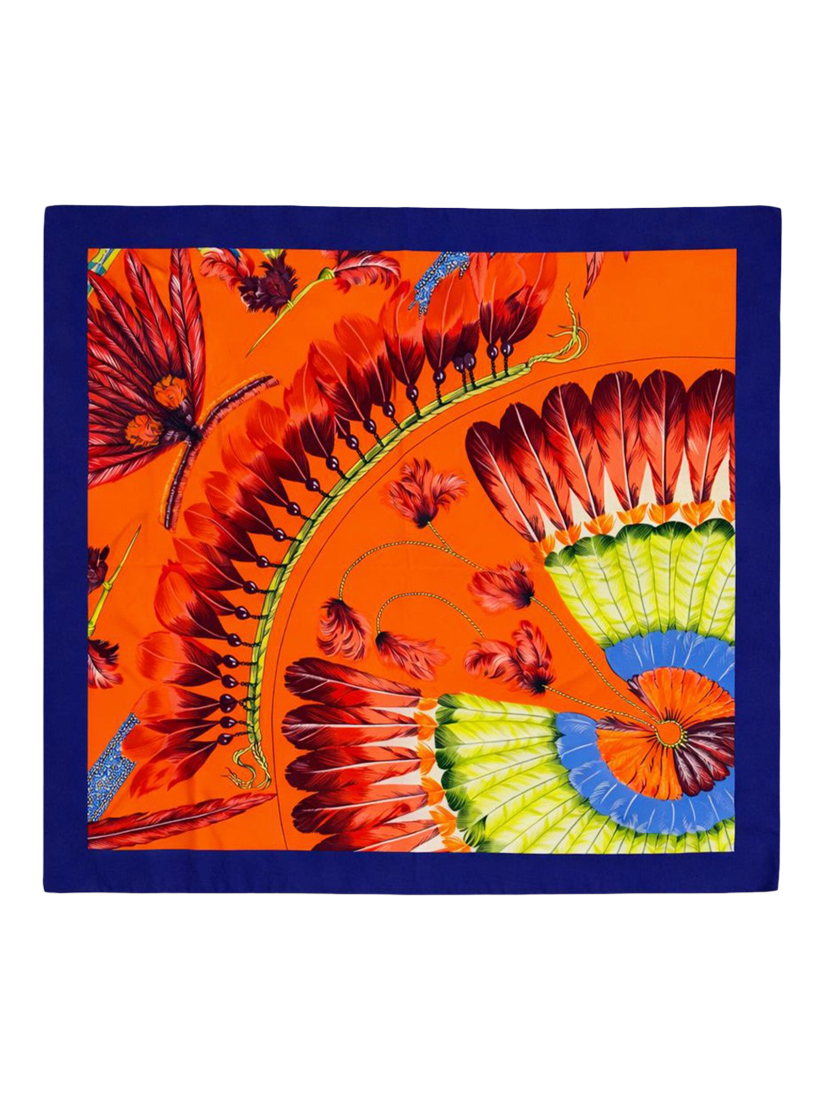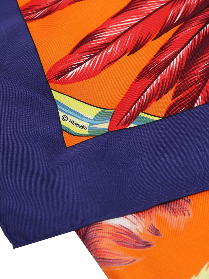 Pre-loved Hermès orange and blue silk feather-print scarf. This item is in very good pre-owned condition, showing no significant signs of wear.