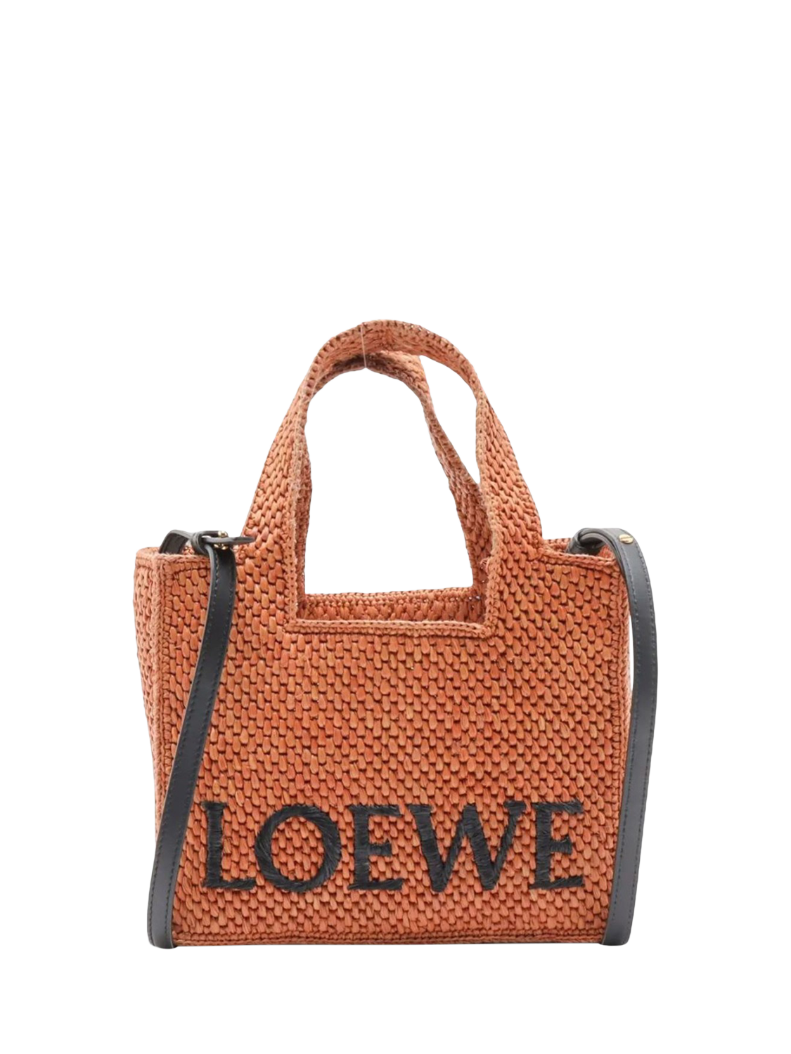 Pre-loved LOEWE tan Font tote in raffia with branding on the front. This bag has two handles and comes with a leather strap. The bag has a single compartment.