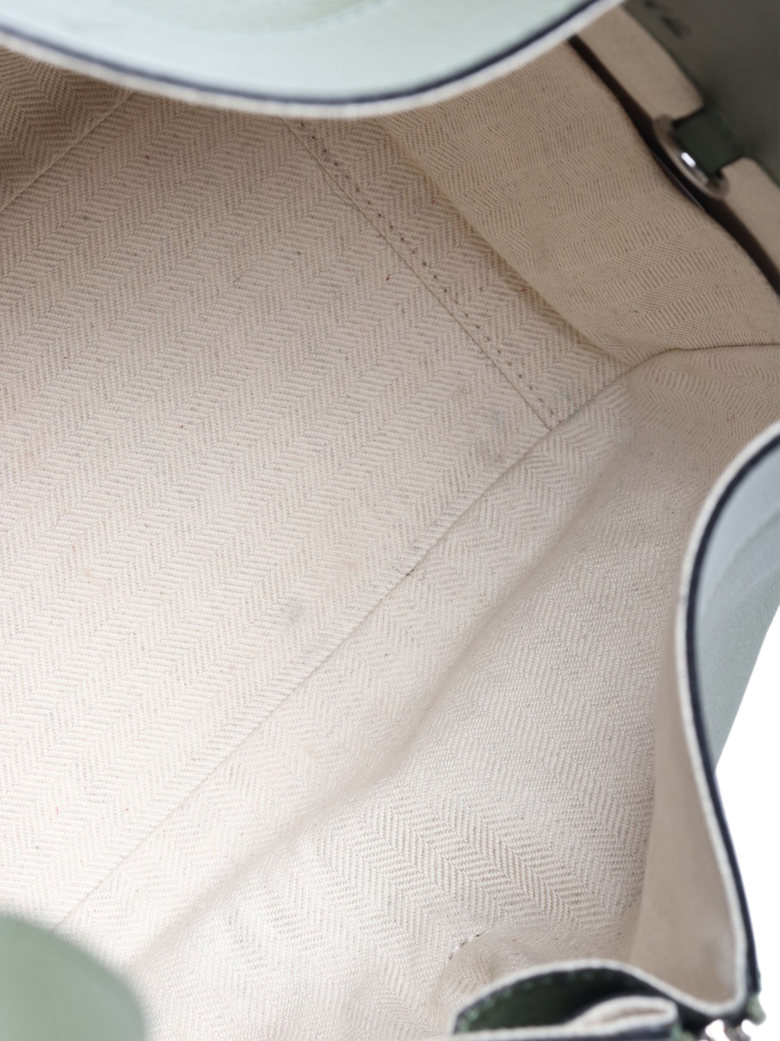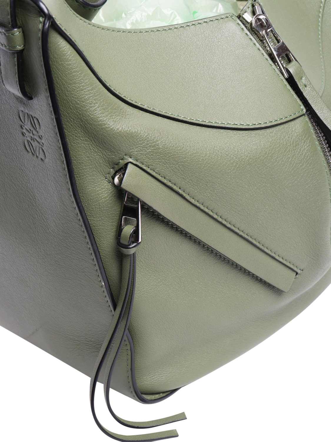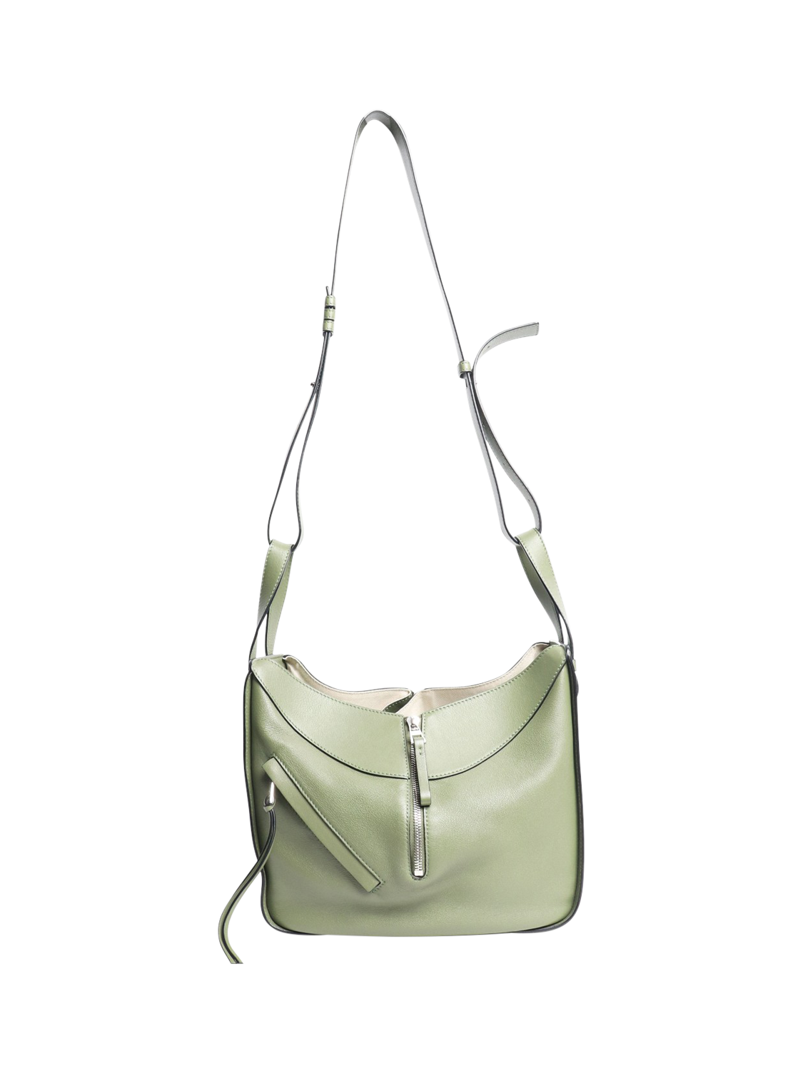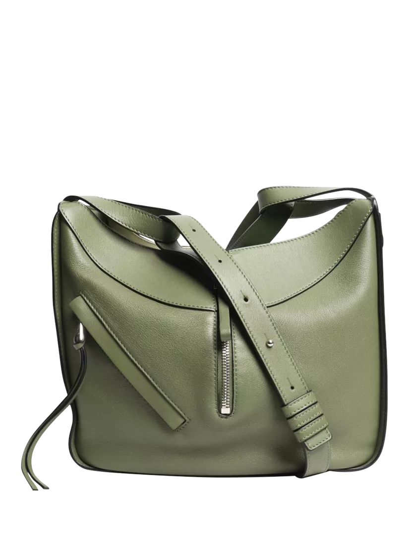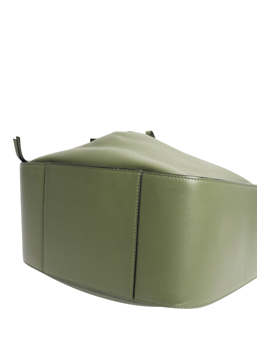 Pre-loved LOEWE Green hammock bag with silver hardware. This bag has a detachable and adjustable strap, internal hook closure, one external zip pocket, two internal slip pockets.