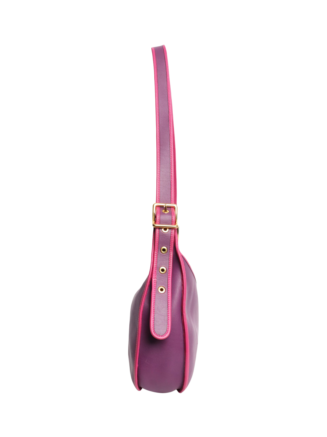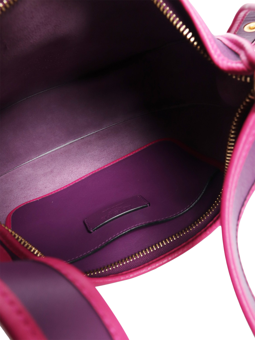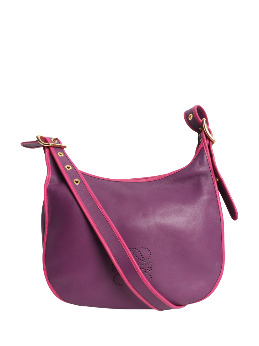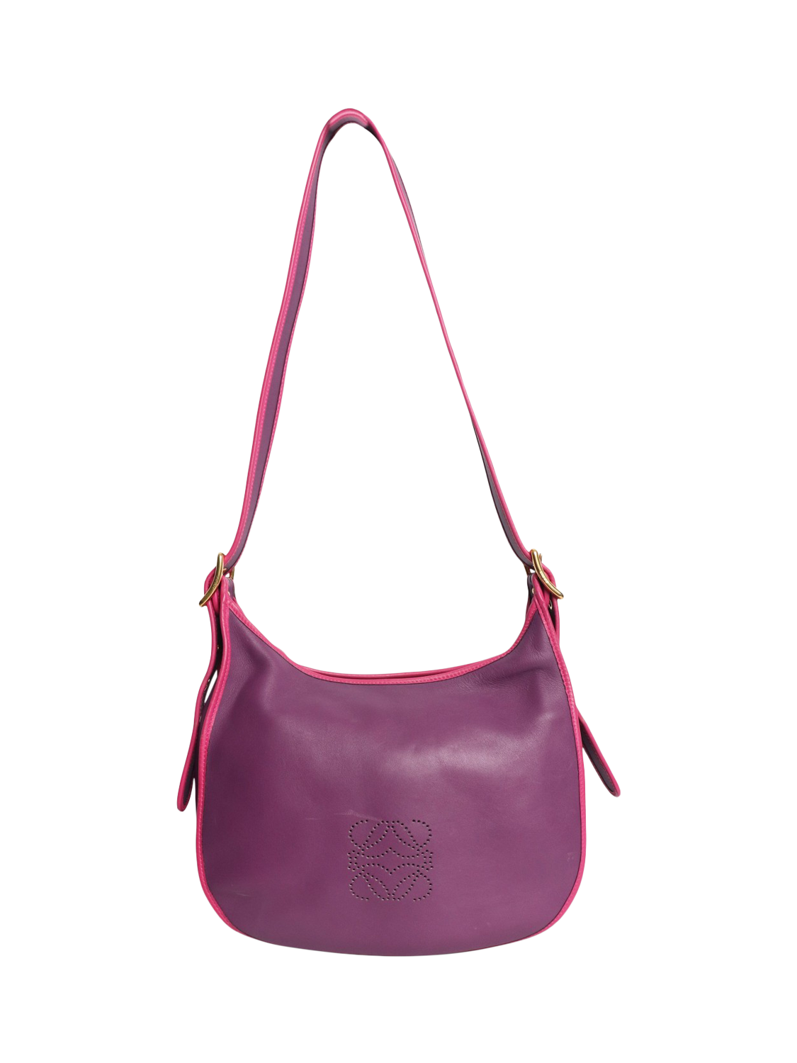 Pre-loved LOEWE purple leather shoulder bag with gold hardware and an adjustable strap. This bag has a main zipped compartment with an interior patch pocket. Outer slip pocket at the rear. Perforated Anagram branding at the front.