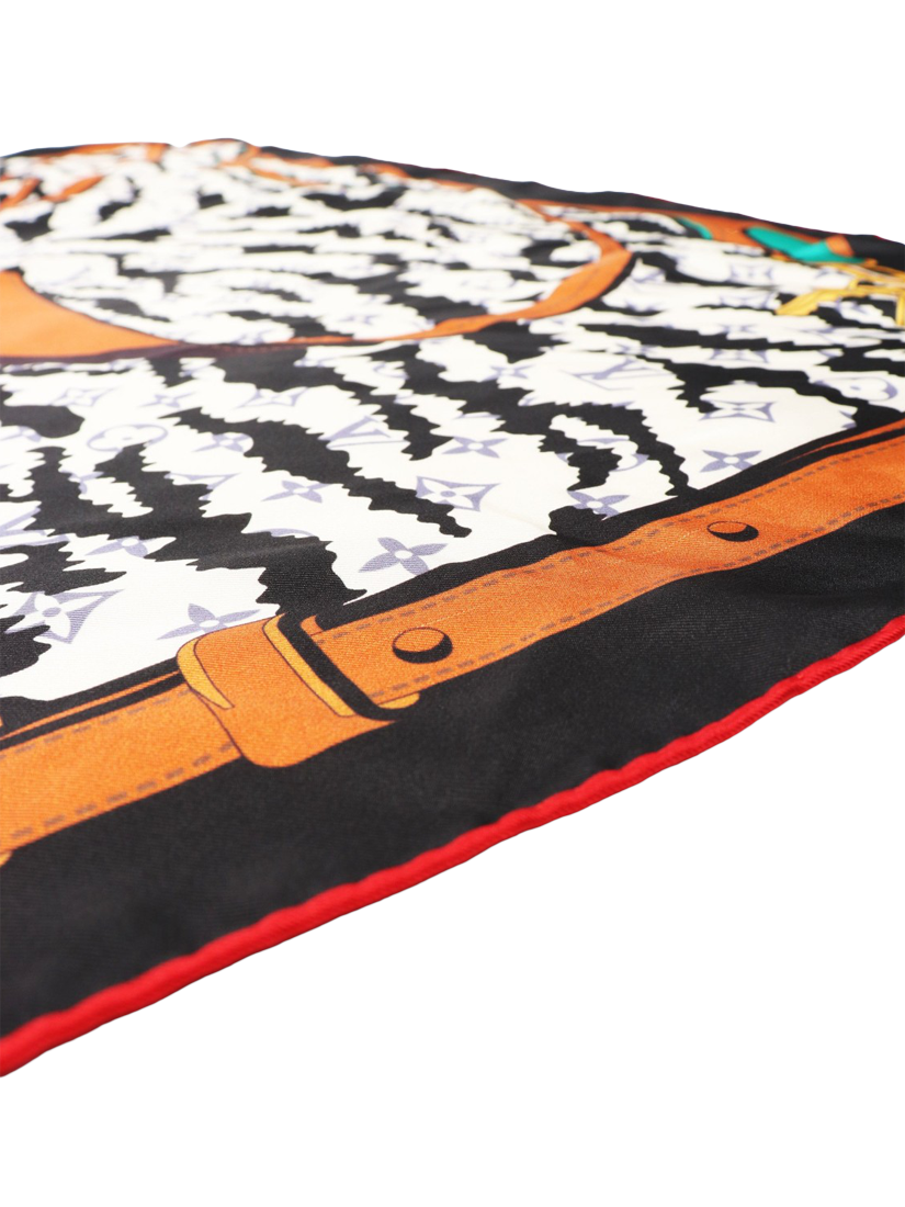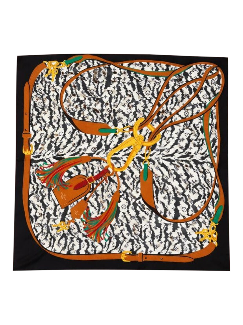 Pre-loved Louis Vuitton black and brown silk key chain printed scarf. This item is in very good pre-owned condition, showing no significant signs of wear.