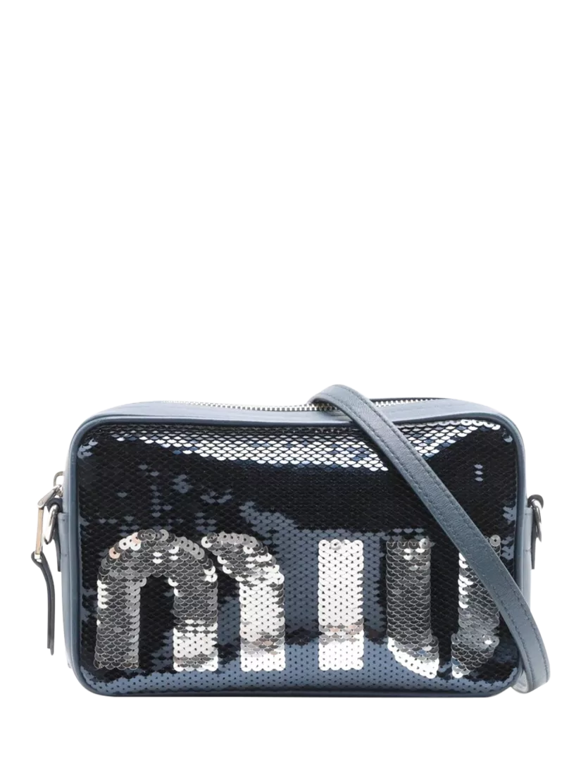 Pre-loved Miu Miu dark blue sequin logo pouch bag with silver hardware. This bag has a main zipped compartment with an interior patch pocket. Metal letter branding on the front. The crossbody strap is removable and adjustable.