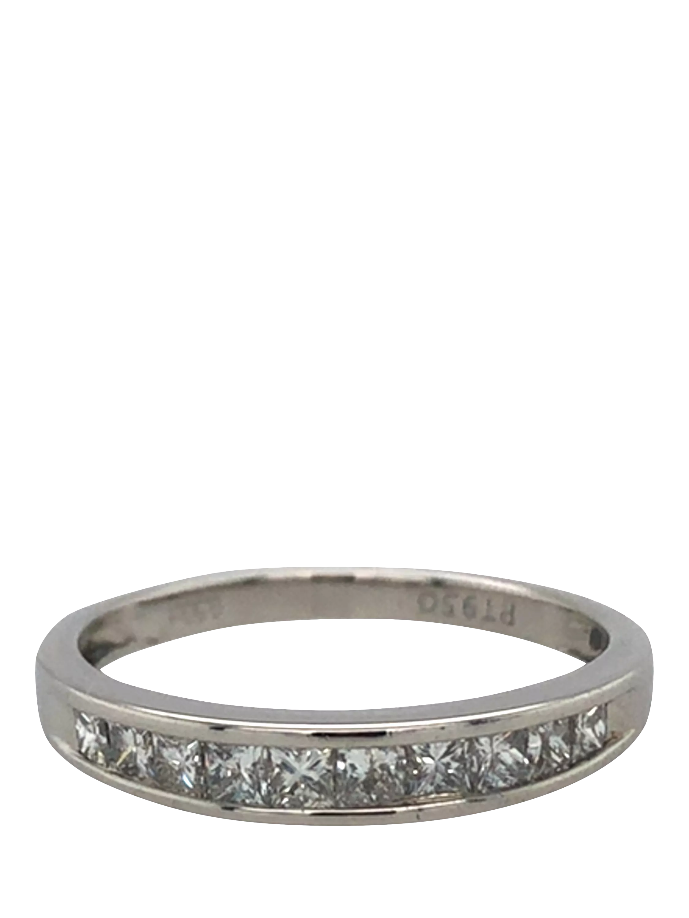 Pre-loved platinum 10-stone princess cut diamond channel-set half eternity ring. Diamond is approx 0.50cts. Presented by Vintage Fine Jewellery. Gram weight: 3.1gms.