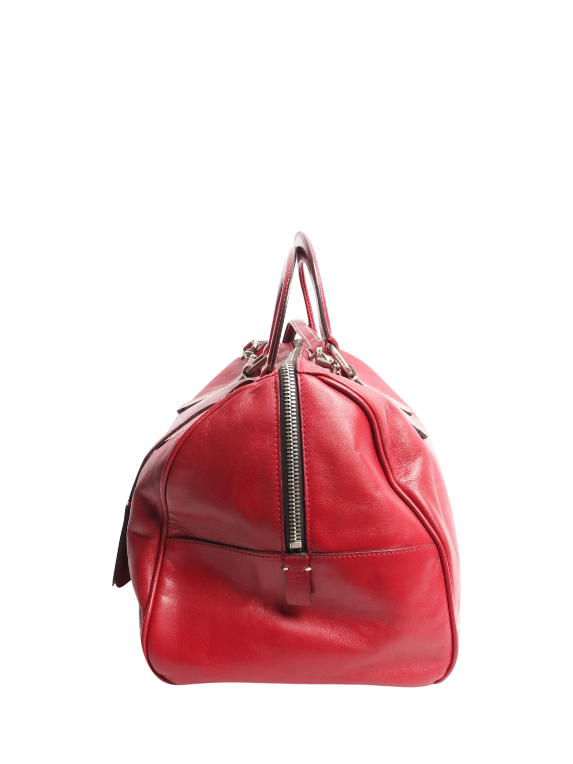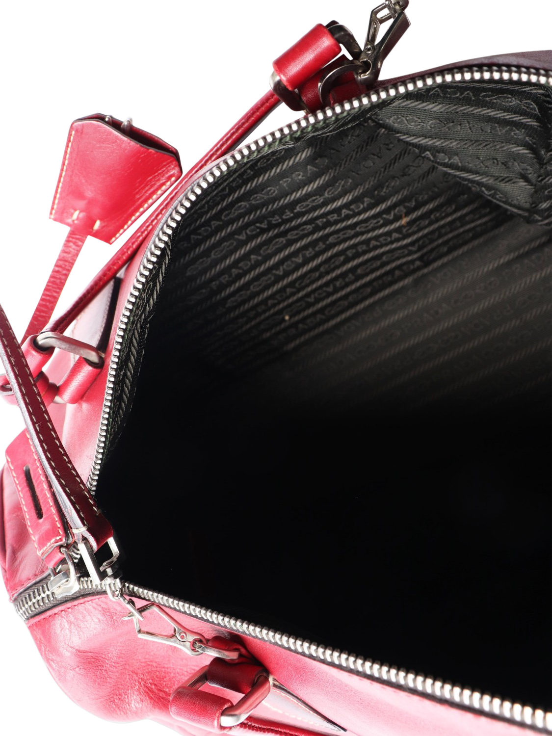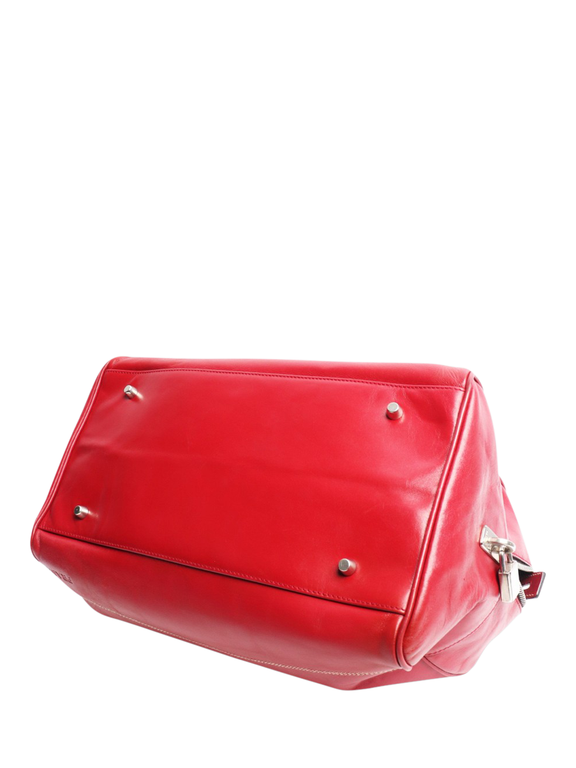 Pre-loved Prada red leather two-way bag with silver hardware. This bag has two handles and comes with a removable strap. The bag has a main zipped compartment with an interior zipped pocket. It comes with a padlock and a set of keys.