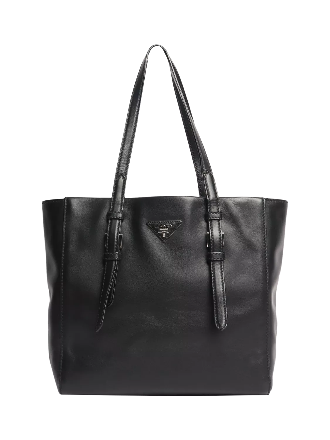 Pre-loved Prada black leather tote bag with silver hardware. This bag has a main compartment, two zip pockets and a split pocket.