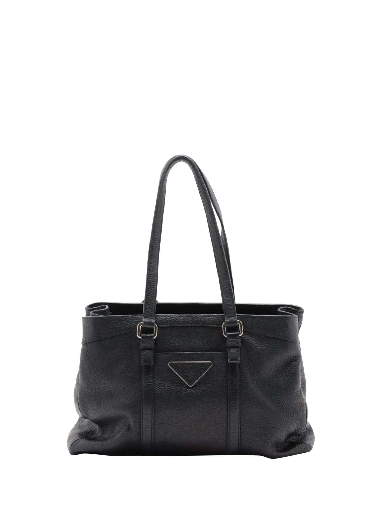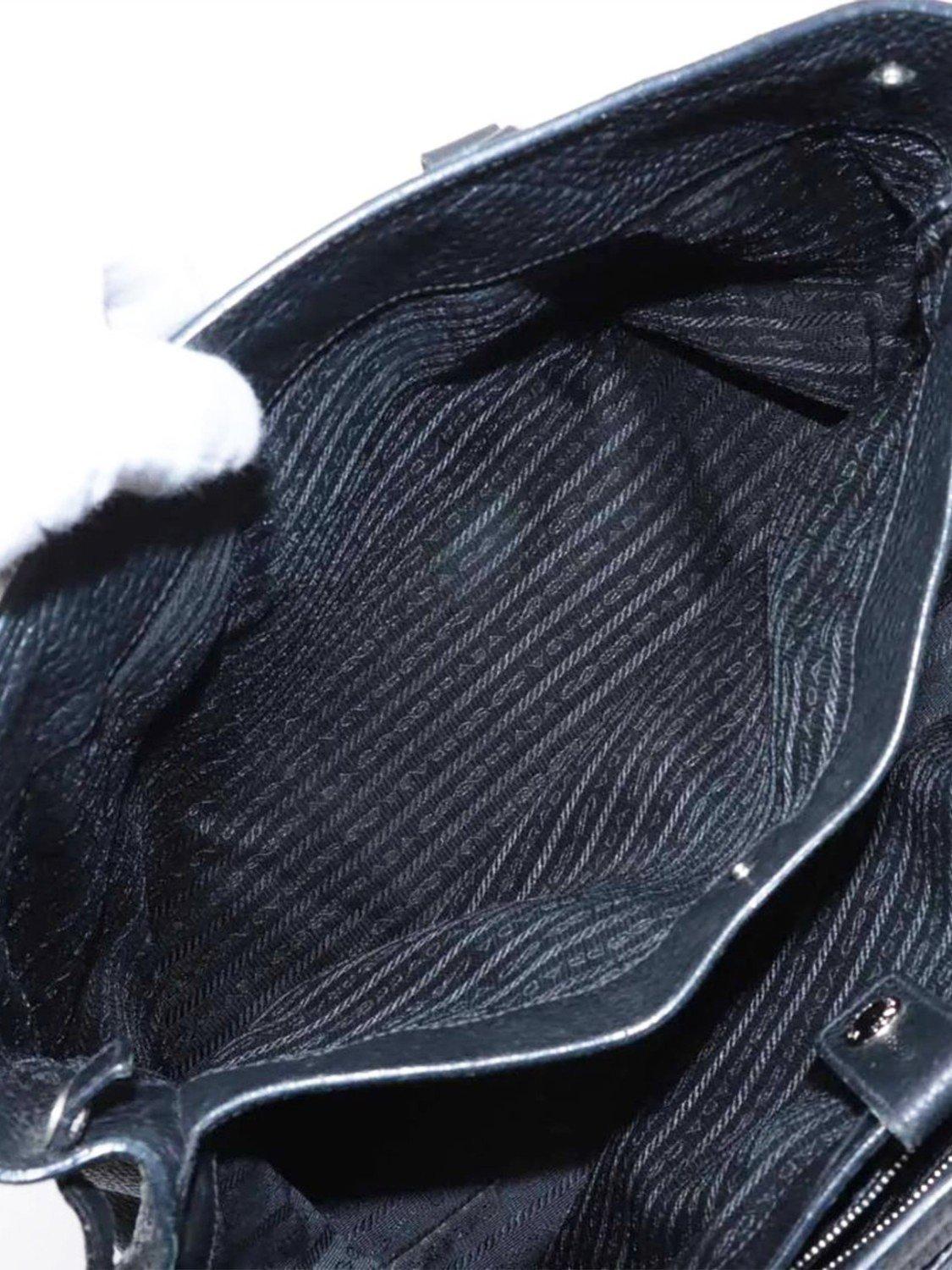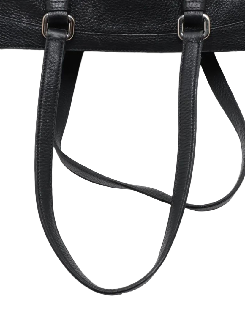 Pre-loved Prada black leather tote bag with silver hardware. This bag has a partitioned compartment with interior zipped and patch pockets. Outer slip pockets. Tonal triangle branding at the front.