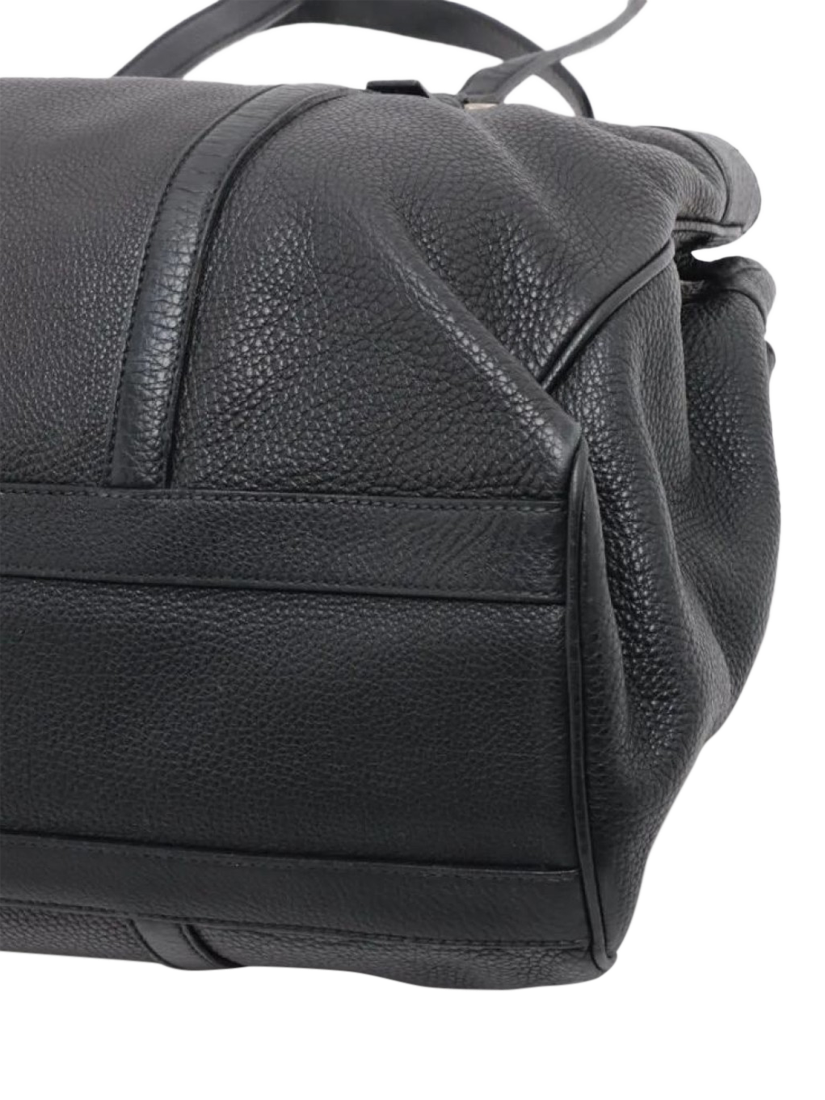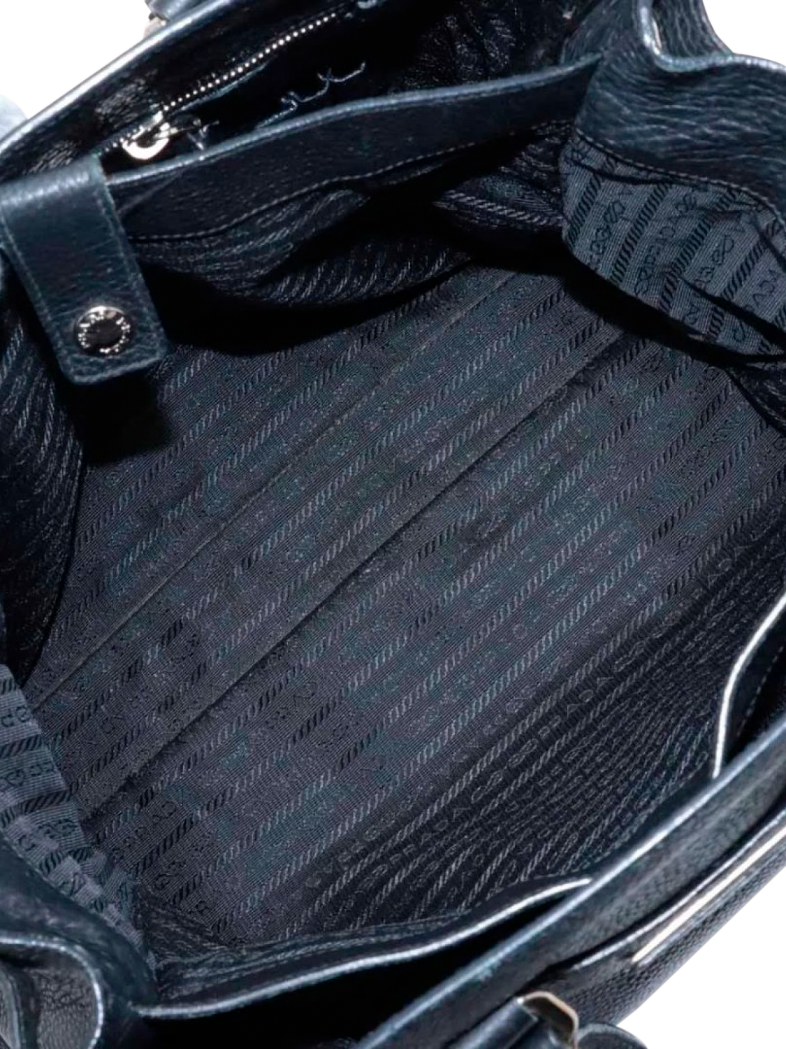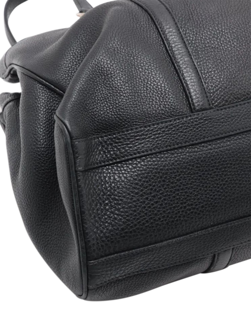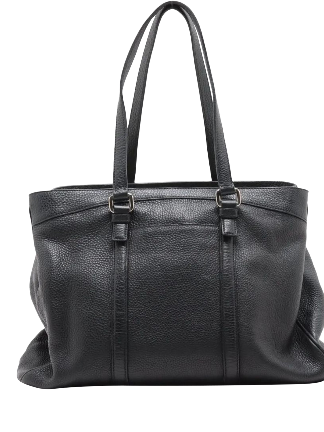 Pre-loved Prada black leather tote bag with silver hardware. This bag has a partitioned compartment with interior zipped and patch pockets. Outer slip pockets. Tonal triangle branding at the front.