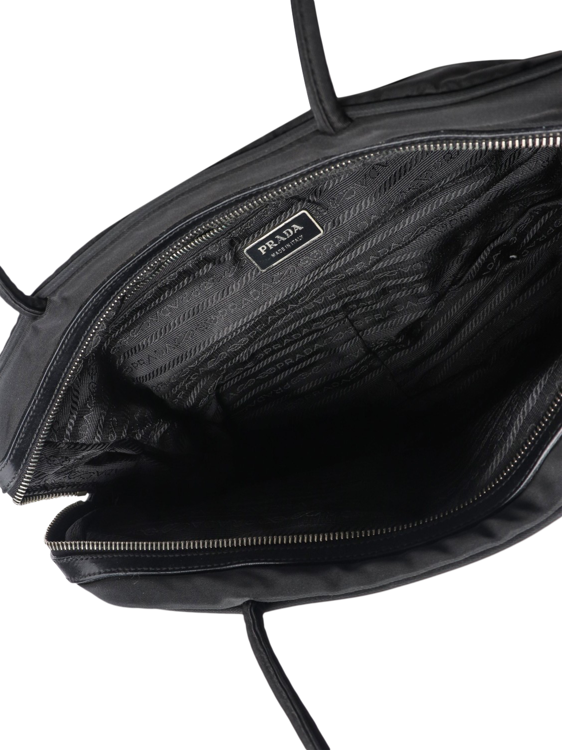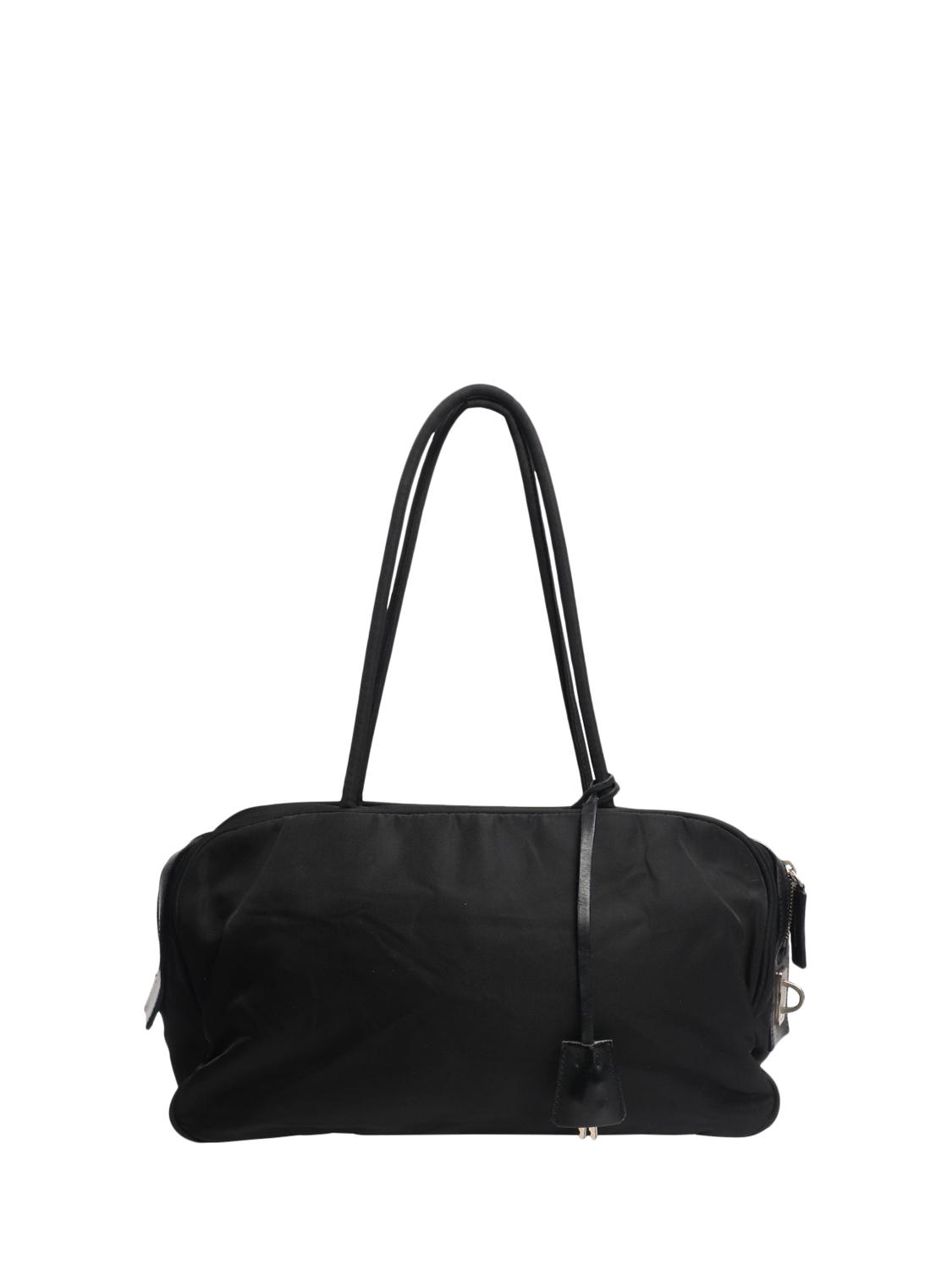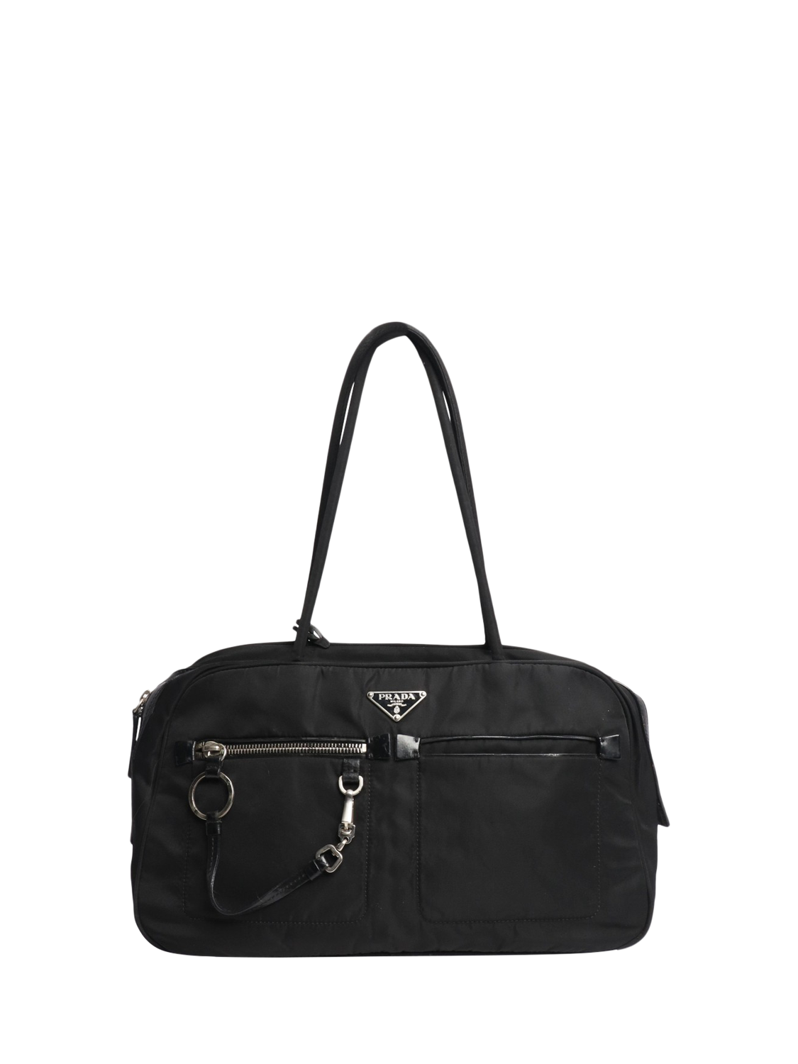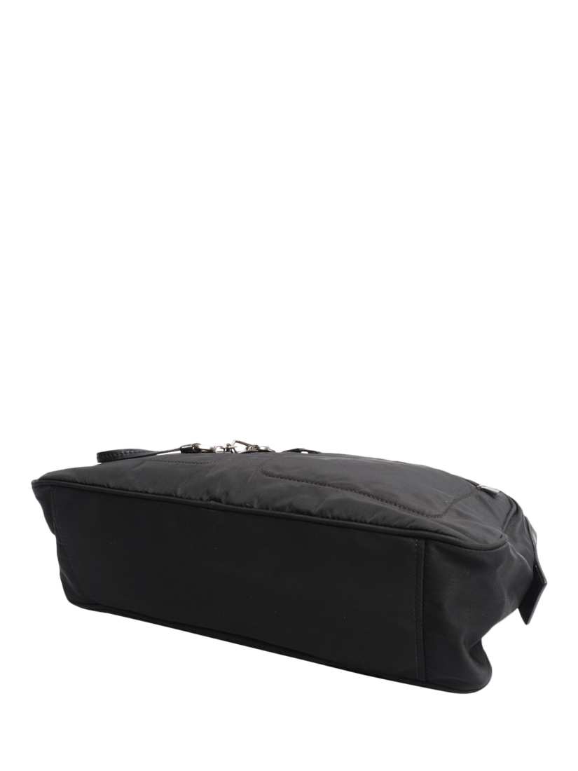 Pre-loved Prada black nylon top handle bag with silver hardware. Main zipped compartment with an interior zipped pocket. Outer pockets on the front. Triangle enamel branding at the front.