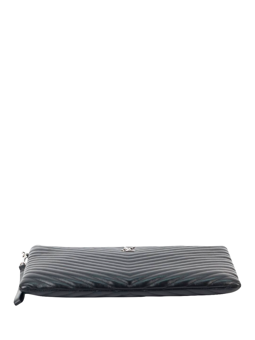 Pre-loved SAINT LAURENT black Matelasse pouch with silver hardware. This clutch has a main zipped compartment with six card slots and interior patch pockets. Plaque branding at the front.