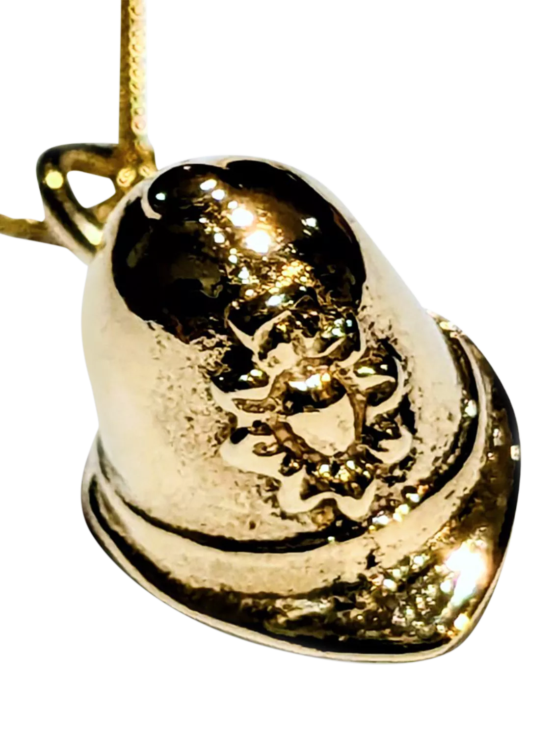 Pre-loved solid 9ct gold Fireman's helmet pendant suspended on a diamond-cut, 9ct gold-plated silver curb chain. Presented by L&T Heirlooms. This piece is boxed, ready for gifting.