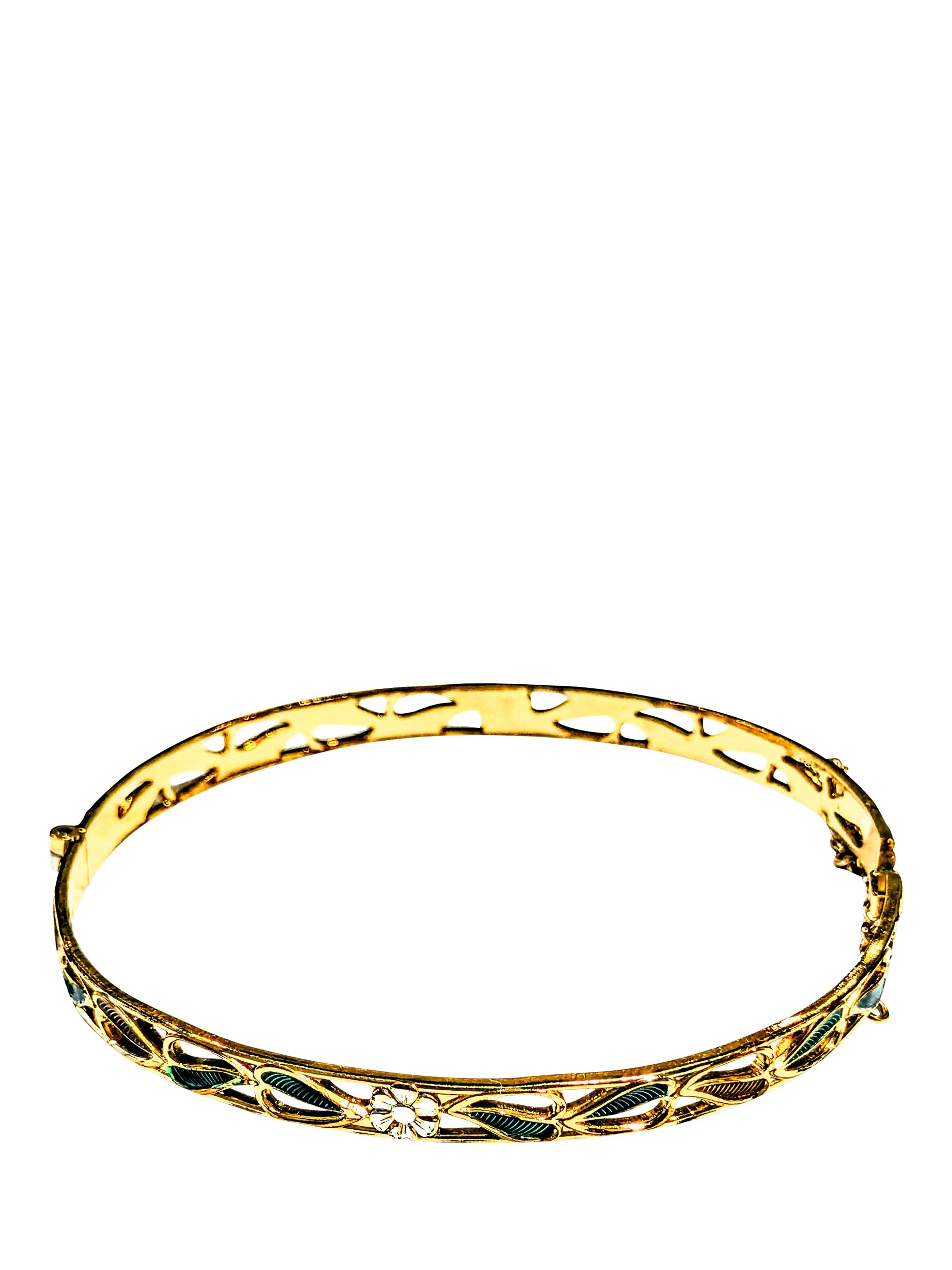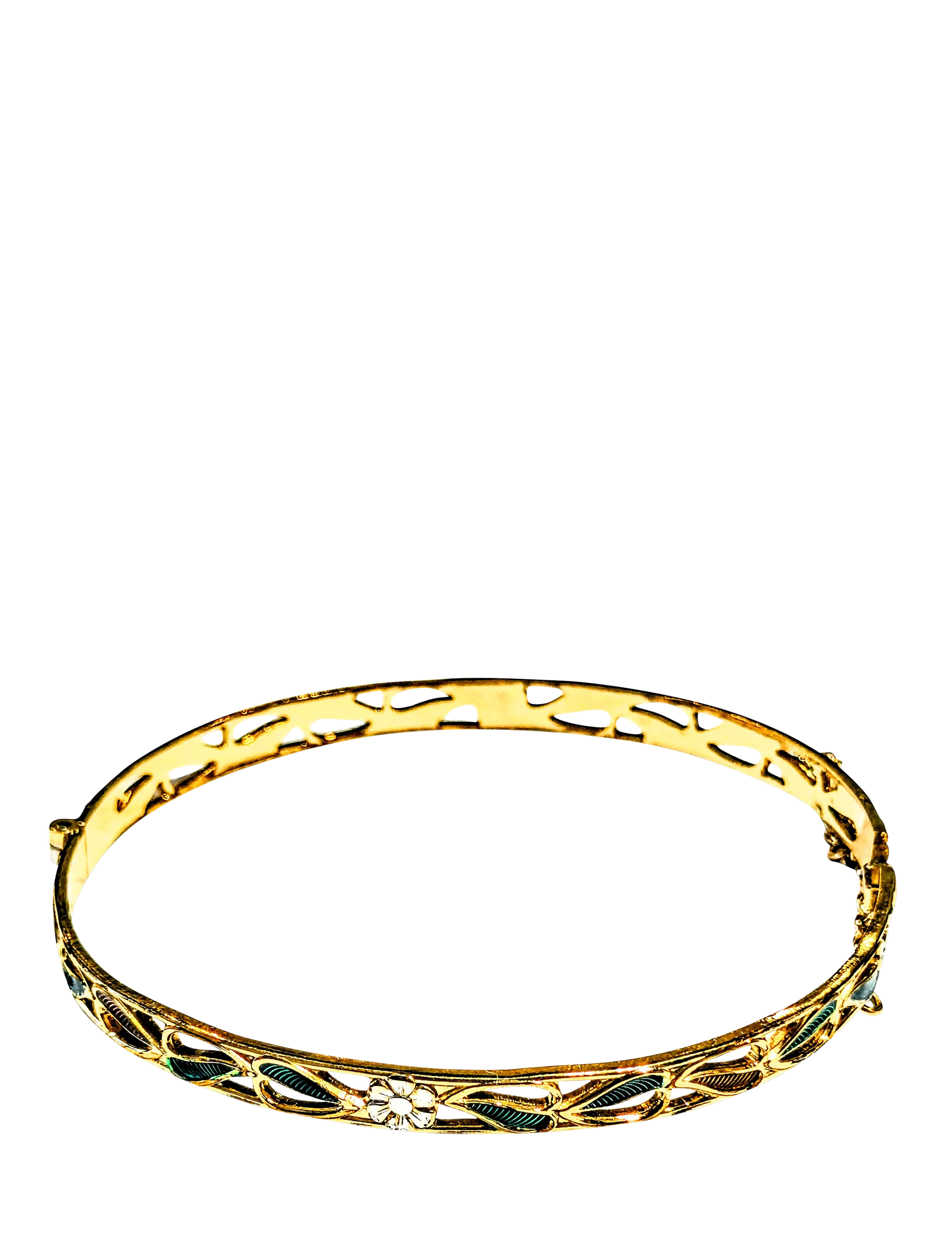 Pre-loved solid 9ct Rolled Gold hinged bangle with safety chain, featuring a floral pattern with green inlayed enamelling. Presented by L & T Heirlooms. Gram weight is 7.8. This piece comes boxed, perfect for gifting.