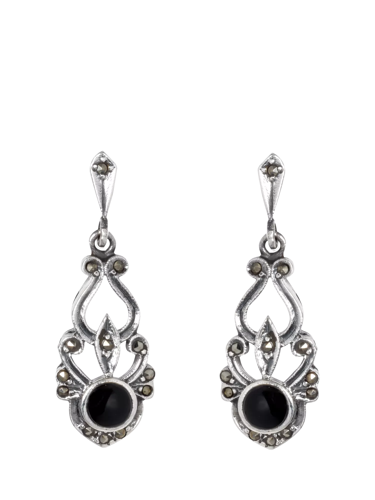 Pre-loved drop earrings in sterling silver with silver Marcasite, and a black onyx stone. Presented by Eclectica in a branded gift box. Suitable for pierced ears only.