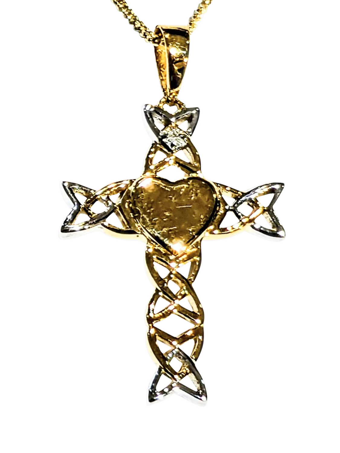 Pre-loved beautiful two-tone 9ct gold Celtic cross set with a single 0.005ct diamond, presented by L&T Heirlooms. Pendant is suspended on a diamond cut 46cm 9ct gold plated silver curb chain. Weight is 1.24gms. This piece is boxed, perfect for gifting.