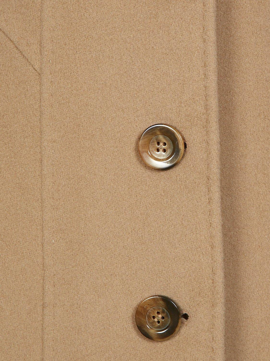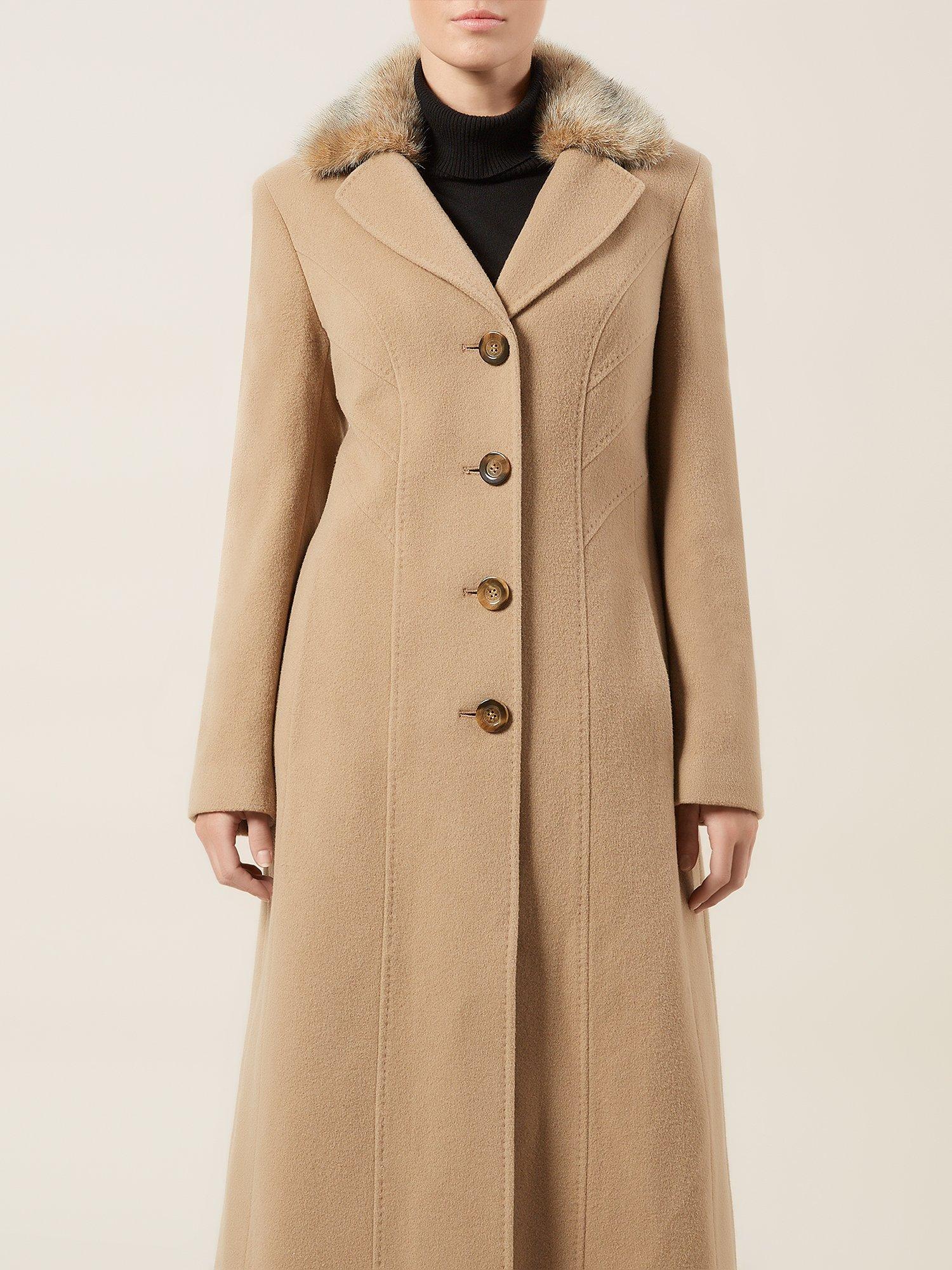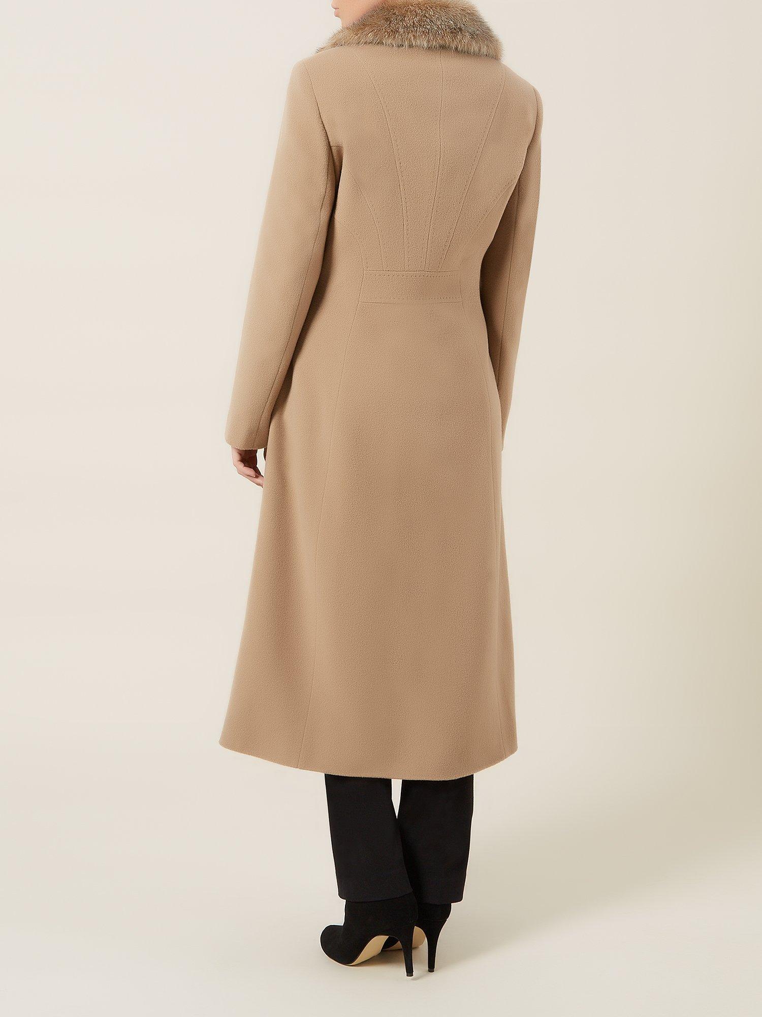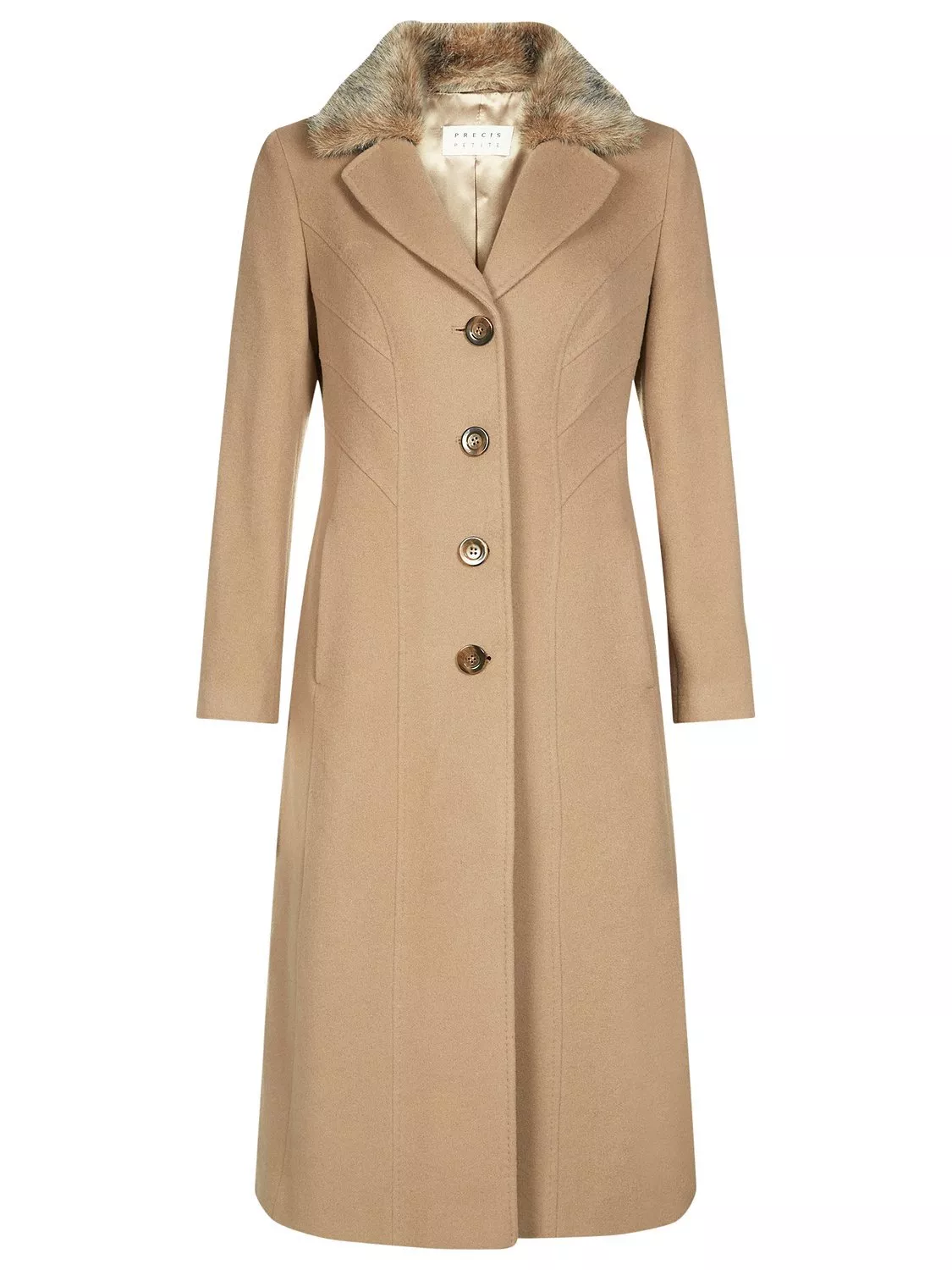 Designed with chic stitch seam detailing, a clean single breasted front and horn-effect buttons, the coat is finished with a stunning detachable faux fur collar.