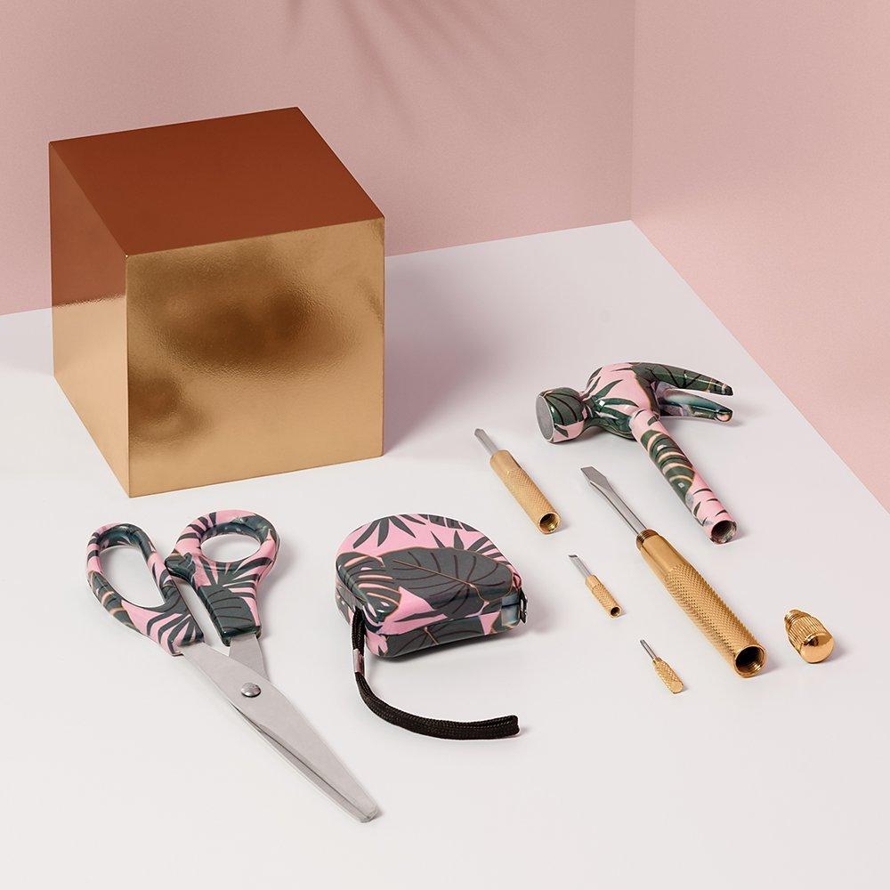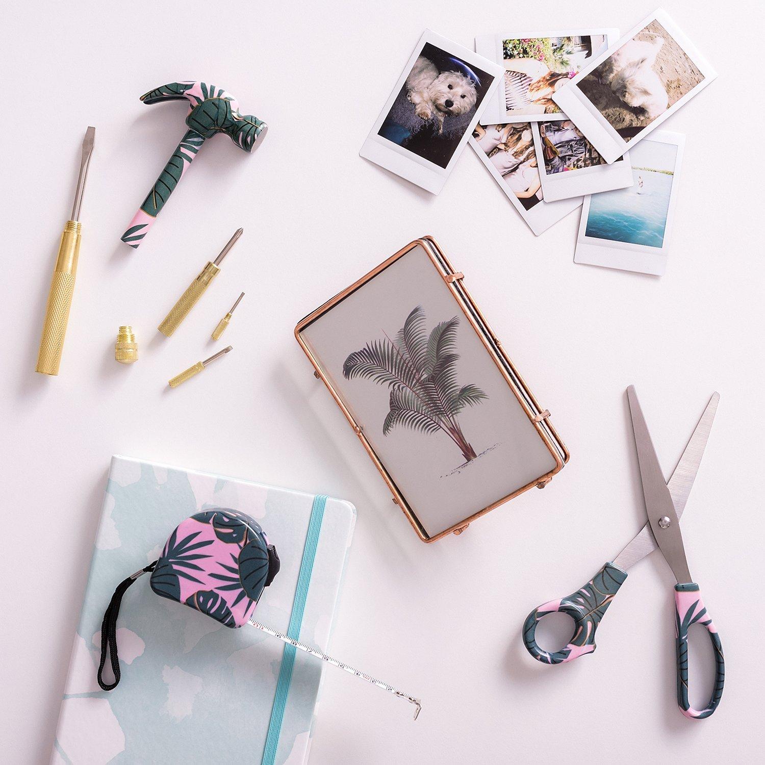 Ideal for weekend crafts and exciting new projects, this handy set is a household essential. Comprising of three Pretty Useful Tools; the 6-in-1 hammer with four screwdrivers nestled inside the handle, the 3m/10ft tape measure with carry loop, belt attachment and lock button, and the stainless steel scissors, all featuring the stylish Pink Paradise print.
