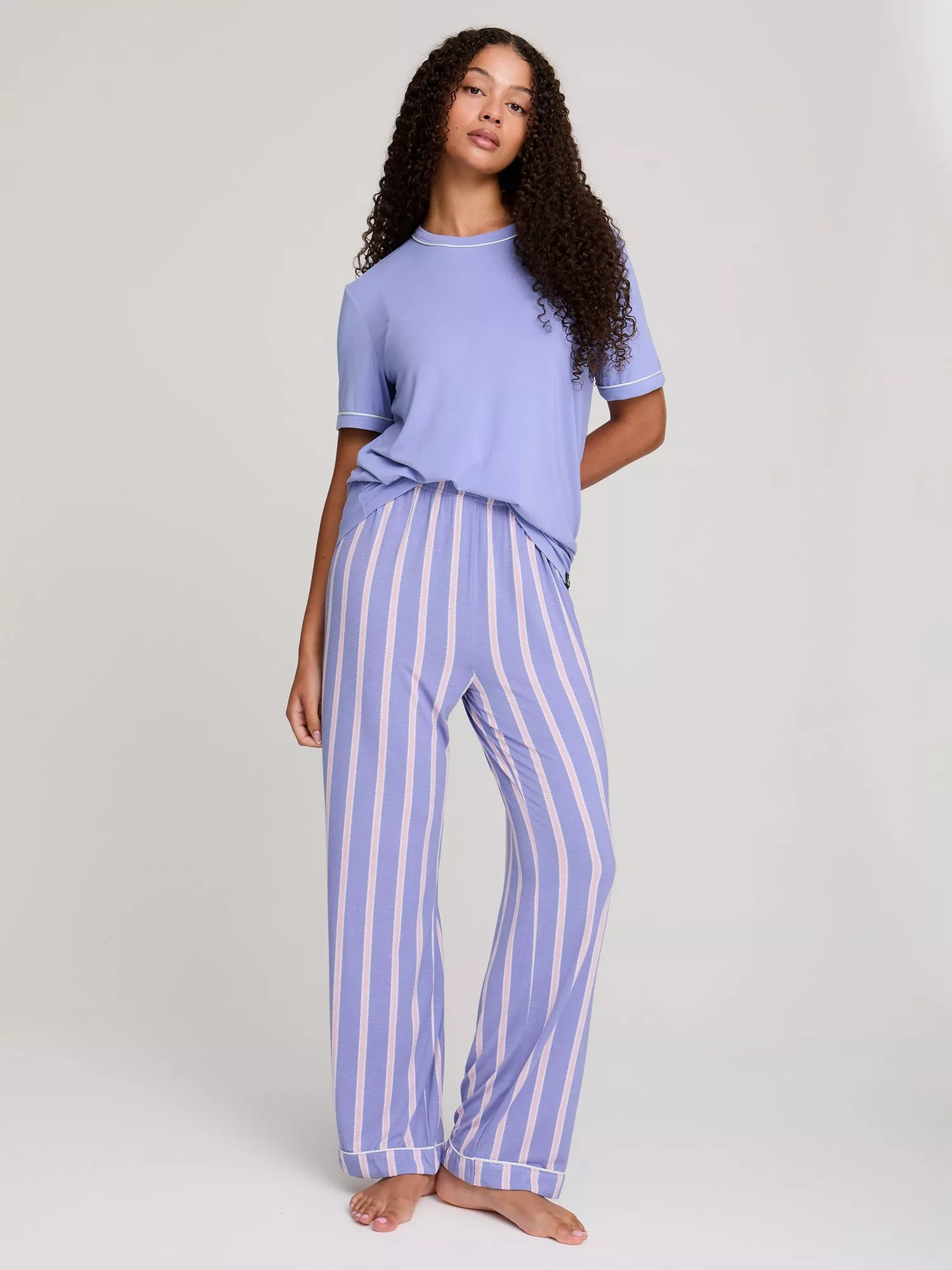 Relax in breathable bamboo comfort with this elegant pyjama set. The relaxed-fit tee features short sleeves and contrast piping for a refined touch, while the striped straight-leg trousers offer a timeless, easy silhouette. Perfect for lounging or a restful night's sleep.