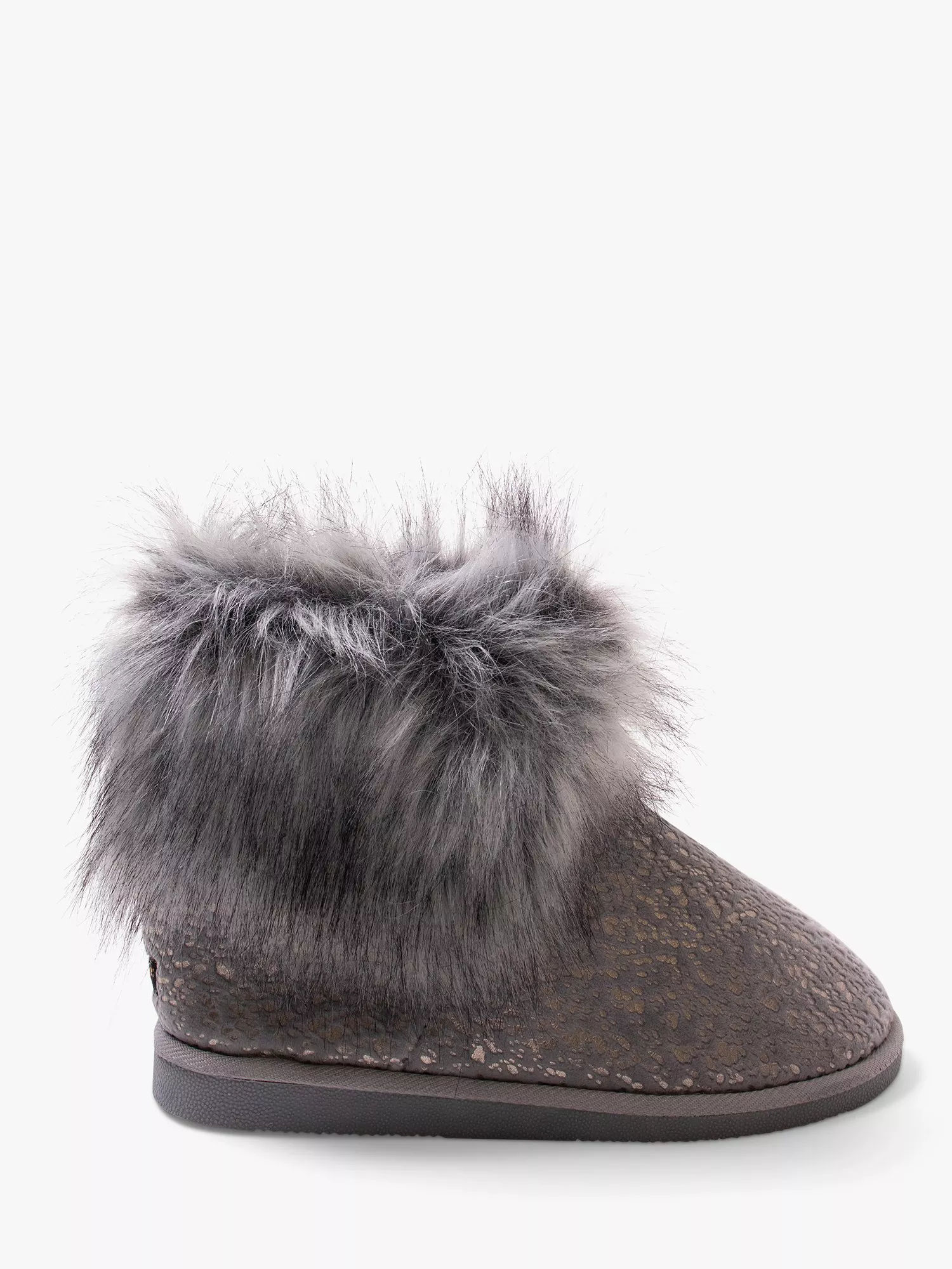 Get lost in a feeling of ultimate comfort with the Giselle ankle boot slippers. Super cosy, faux fur lined slipper booties with a plush, cushioned insole. The rubber soles allow for extra grip and quick trips outside. Giselle has a tonal foil print for a glamorous finish, and tipped faux fur cuff for added warmth and style.